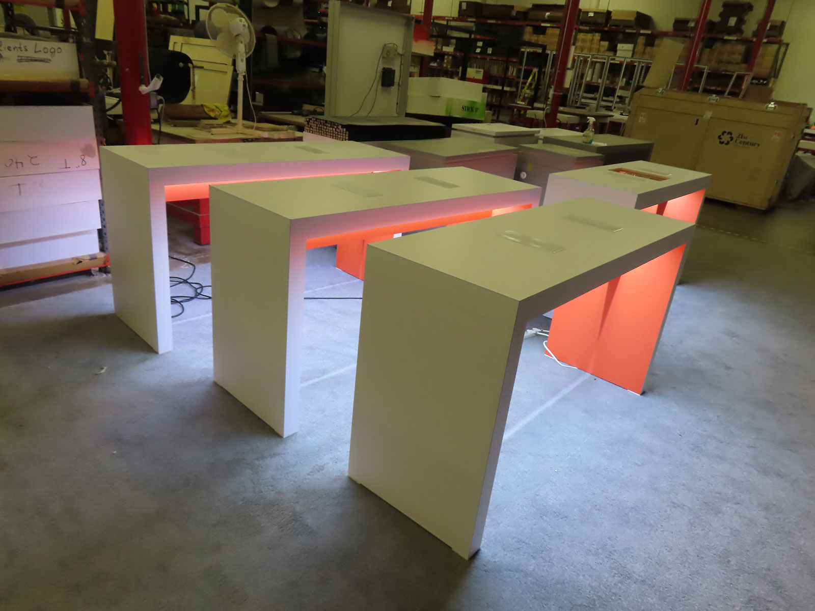 (1) MOD-1736, (4) MOD-1593, and (2) MOD-1596 Custom Counters with Programmable RGB LED Accent Lights, Grommets, and Locking Storage [ORD-69894]