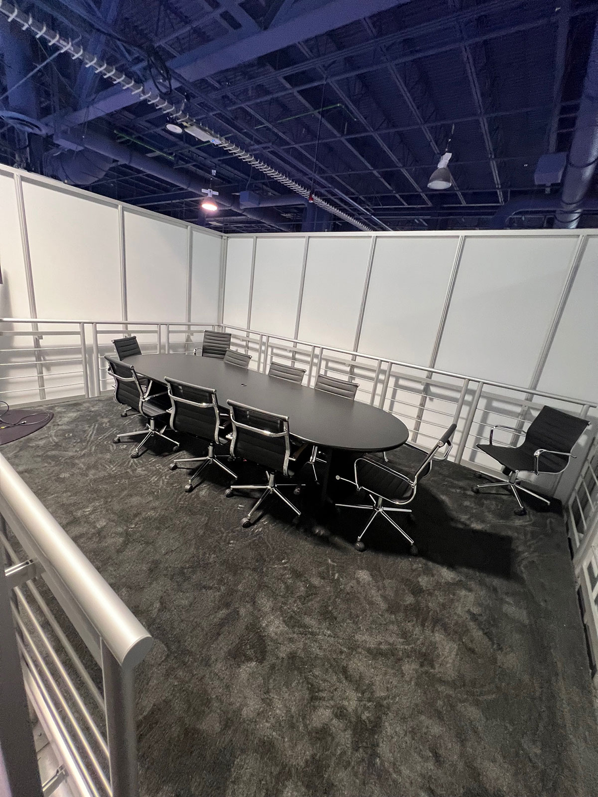 RENTAL: RE-9020 Medium Double Deck Design with Meeting Room with Frosted Acrylic Window Panels, Upper and Lower Walls, Drop Ceiling, (10) Adjustable Can Lights, Staircase Risers, White Unprinted Sintra Insert and Infill Panels, SEG Fabric Graphic for Uppe RENTAL: RE-9020 Medium Double Deck Design with Meeting Room -- View 2 RENTAL: RE-9020 Medium Double Deck Design with Meeting Room -- View 3 RENTAL: RE-9020 Medium Double Deck Design with Meeting Room -- View 4 RENTAL: RE-9020 Medium Double Deck Design with Meeting Room -- View 5 RENTAL: RE-9020 Medium Double Deck Design with Meeting Room -- View 6