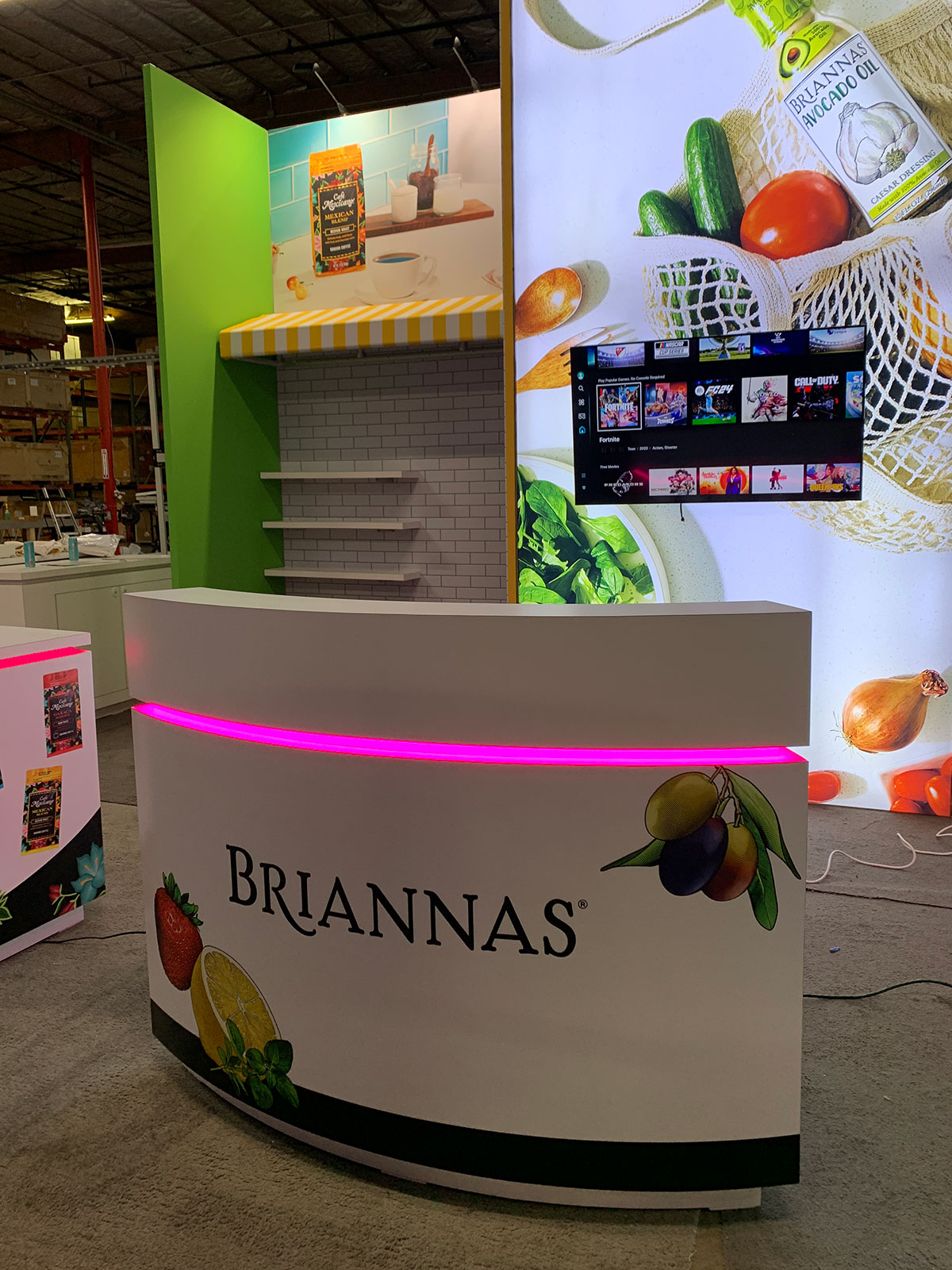 Custom Laminated Inline Exhibit with LED Accent Lights, Halo Lit Logo Sign, Shelves, Pony Wall, Monitor Mount, and Custom Counter with Open Back and Shelves Custom Laminated Inline Exhibit with LED Accent Lights -- View 2 Custom Laminated Inline Exhibit with LED Accent Lights -- View 3 Custom Laminated Inline Exhibit with LED Accent Lights -- View 4