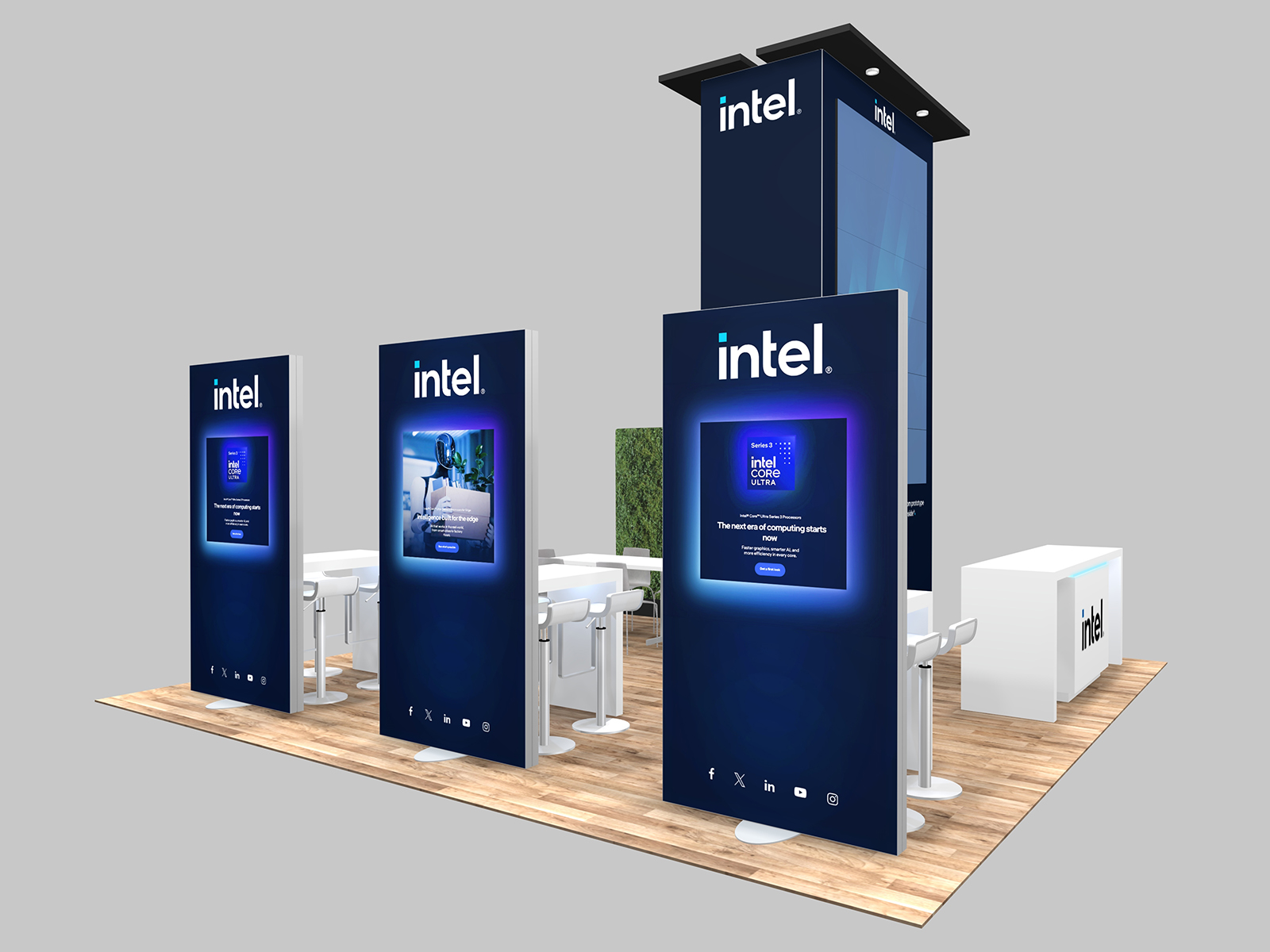 RE-9219 Island Rental Trade Show Exhibit -- Image 2The 20 x 20 exhibit includes casual and demo seating, closet and counter storage, and monitor mounts. The central tower supports a video tile option along with walk-in closet storage. The waterfall counters attach to double-sided SuperNova lightboxes with backlit fabric graphics.