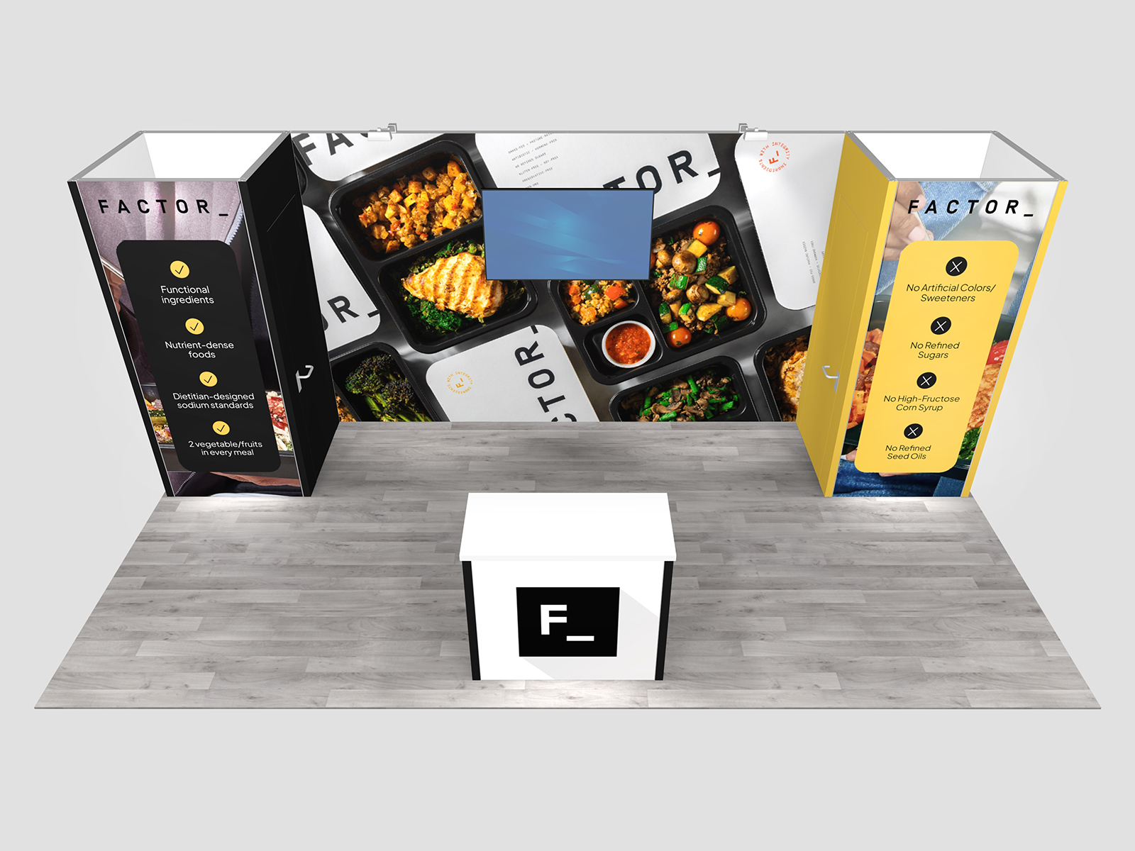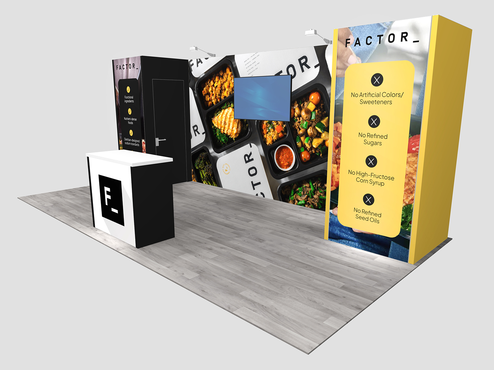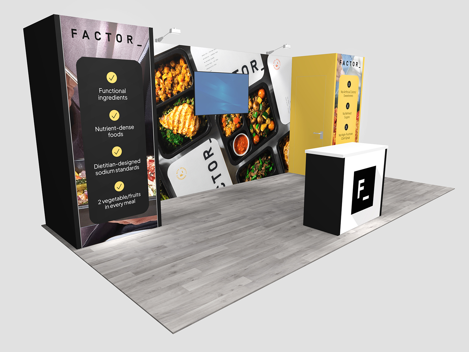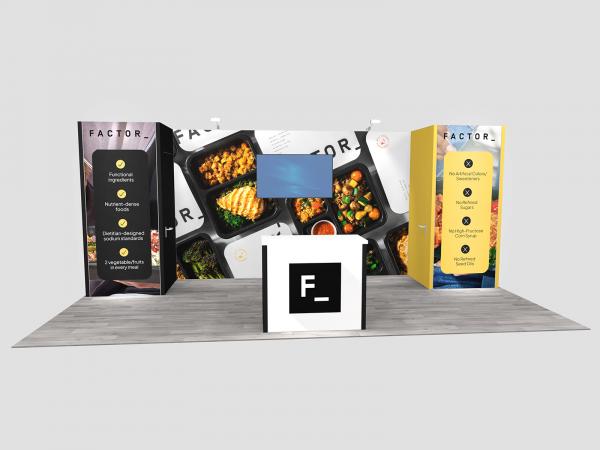 When “modular” meets “rentals” meets “creative design,” everyone wins! The RE-2172, RE-2173, and RE-2174 inline exhibits are versatile Gravitee One-Step Modular designs guaranteed to attract attention on the show floor and save on installation and dismantle. All three have SEG fabric graphics, closet storage, and monitor mounts.