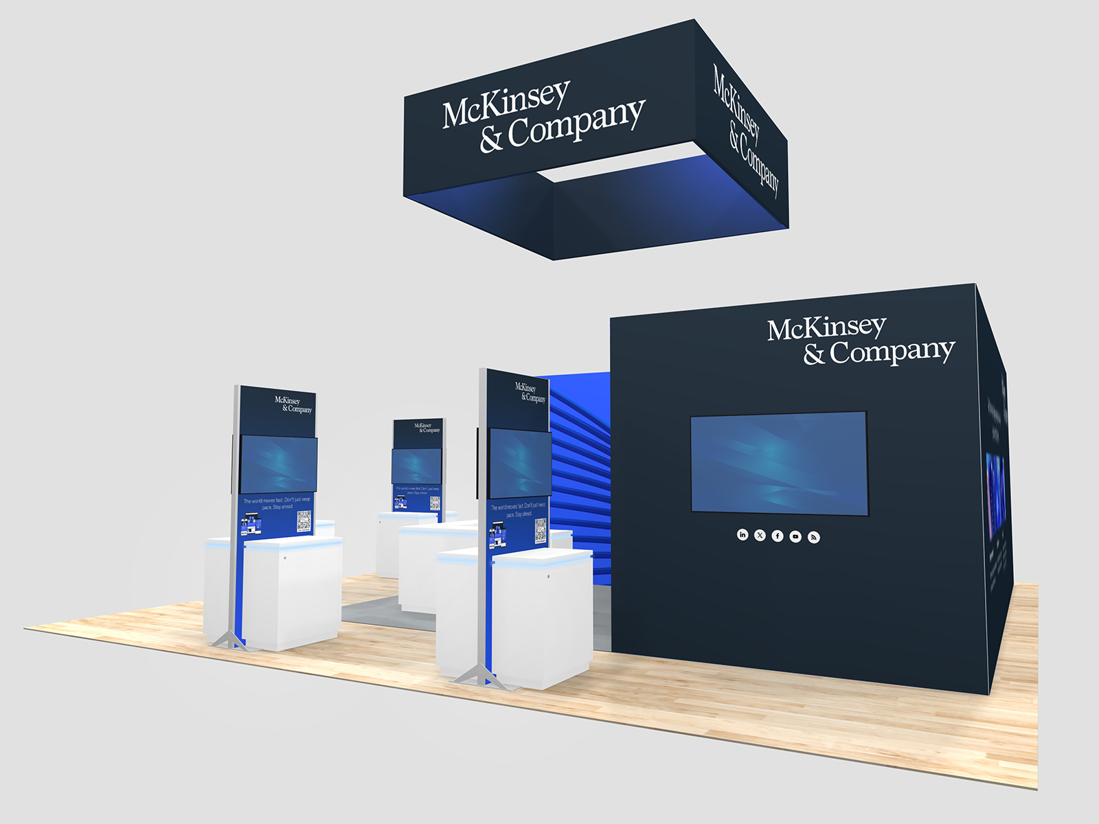 All those exterior walls are ideal for large format graphics. The branding and messaging potential is impressive, and the hanging sign serves as the perfect visual beacon to attract trade show attendees from the farthest corners of the floor. Best of all, the modular walls assemble without tools, and the counters are fully assembly. For a 30 x 30 island, installation couldn't be faster, simpler, or more stress-free.