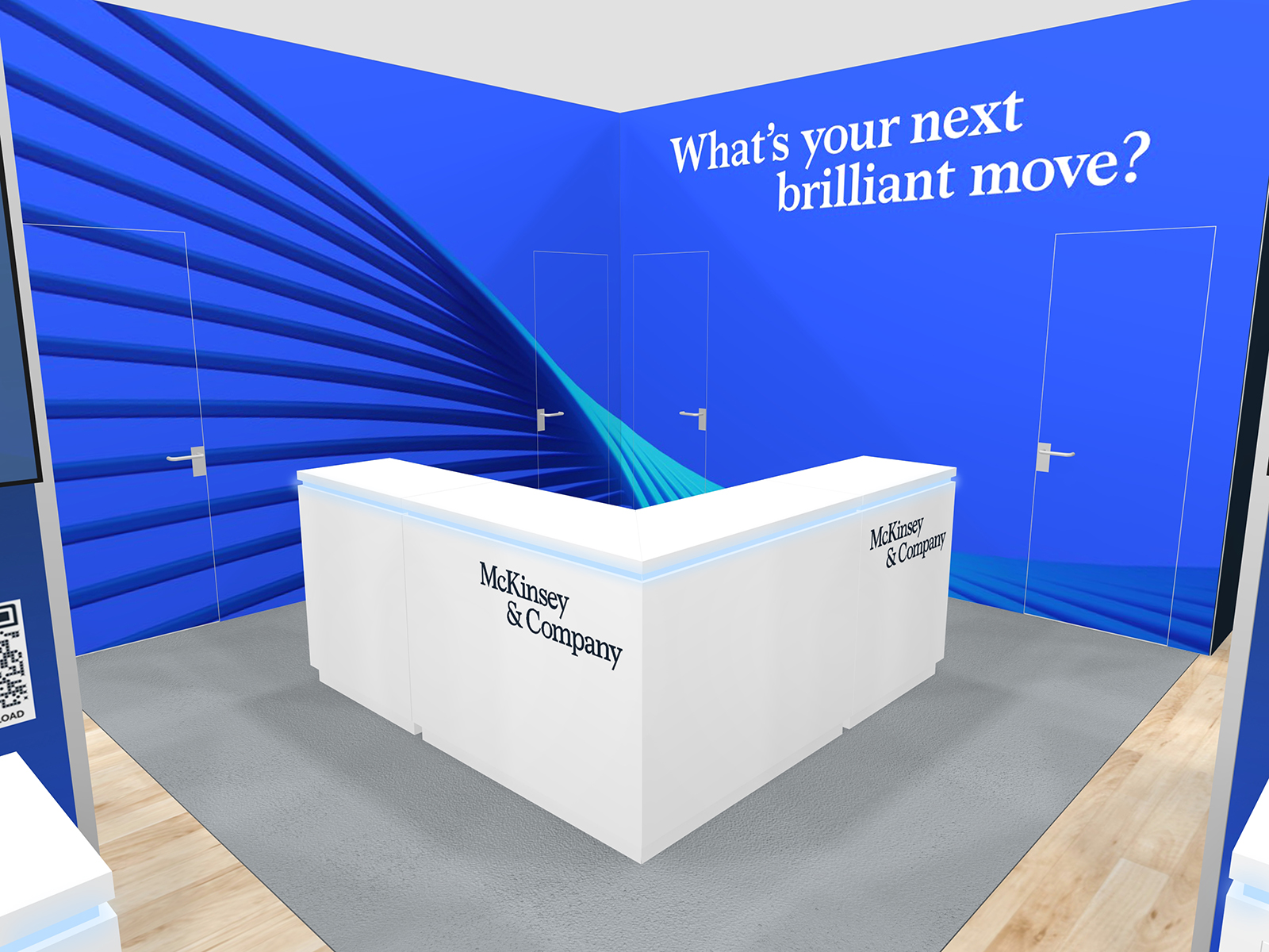 Not every trade show exhibit looks like a trade show exhibit. Take the RE-9224 rental for example. It’s all business with (3) enclosed conference rooms, (4) double-sided monitor kiosks, and a large reception counter with locking storage. In addition, there’s additional monitors in all the meeting spaces and even a counter in the largest one.