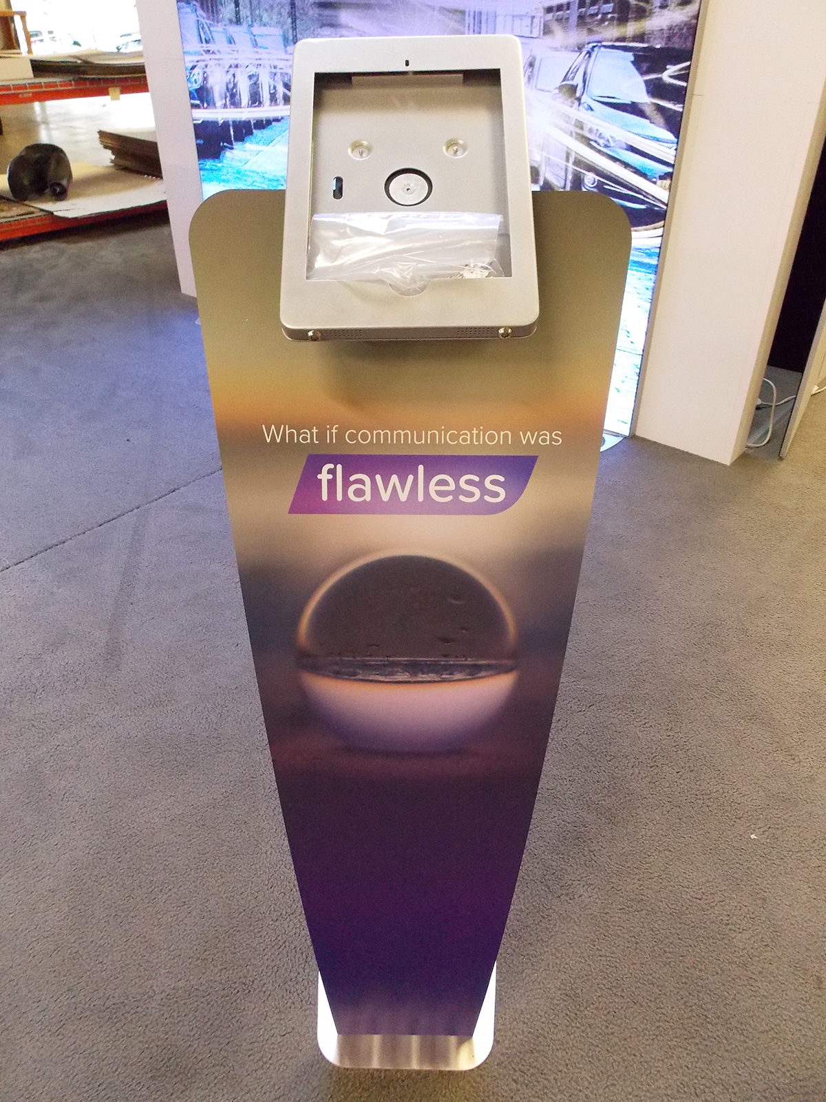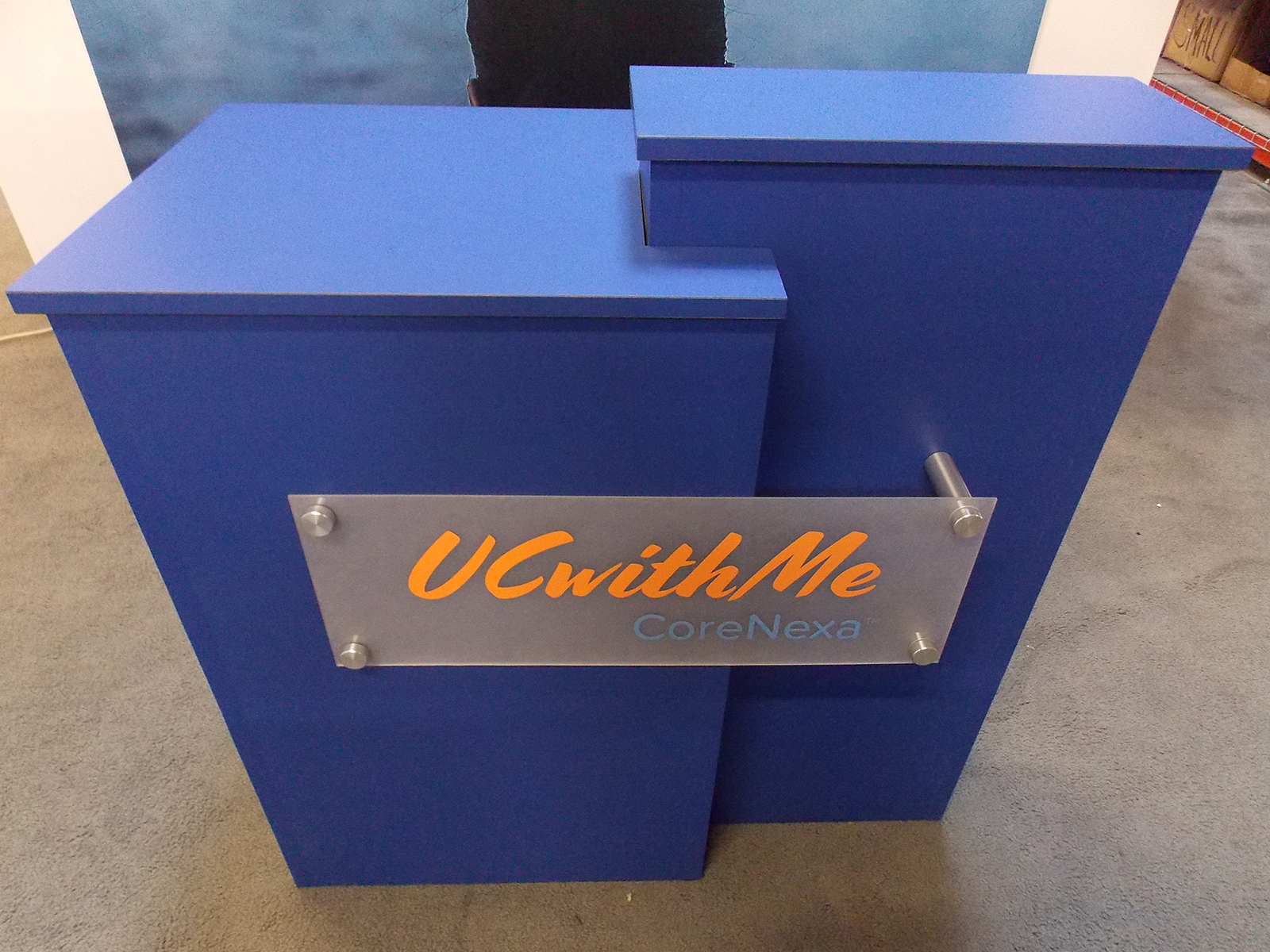 Modified ecoSmart ECO-4053 Backlit Sustainable Exhibit, Lightweight Recycled Aluminum Frames with LED Perimeter Lighting, Locking Storage, (2) FSC Wood Corner Walls with Lap Top Shelves, (1) ECO-8C Reception Counter and (2) 12K iPad Stands [52828]