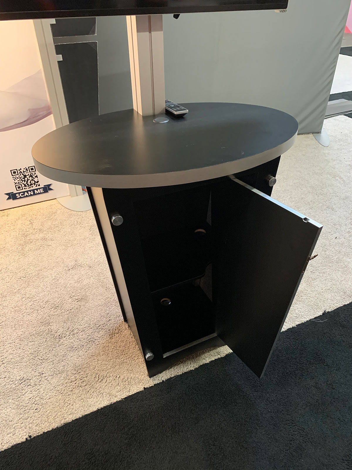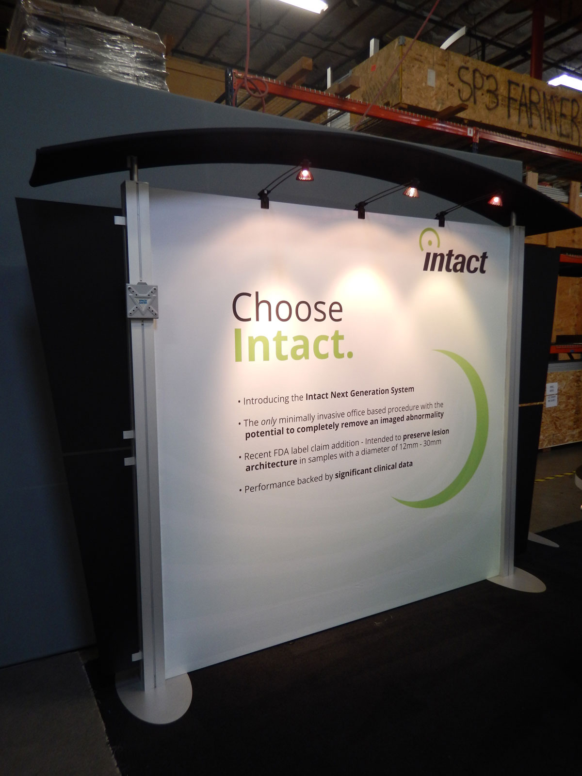 RENTAL: RE-1014 with Black Accent Wings, Arch Canopy with Black Pillowcase Cover, (3) Arm Lights, RE-1223 Black Tapered Counter Kiosk with Monitor Mount and 40” Monitor, and Tension Fabric Graphic.