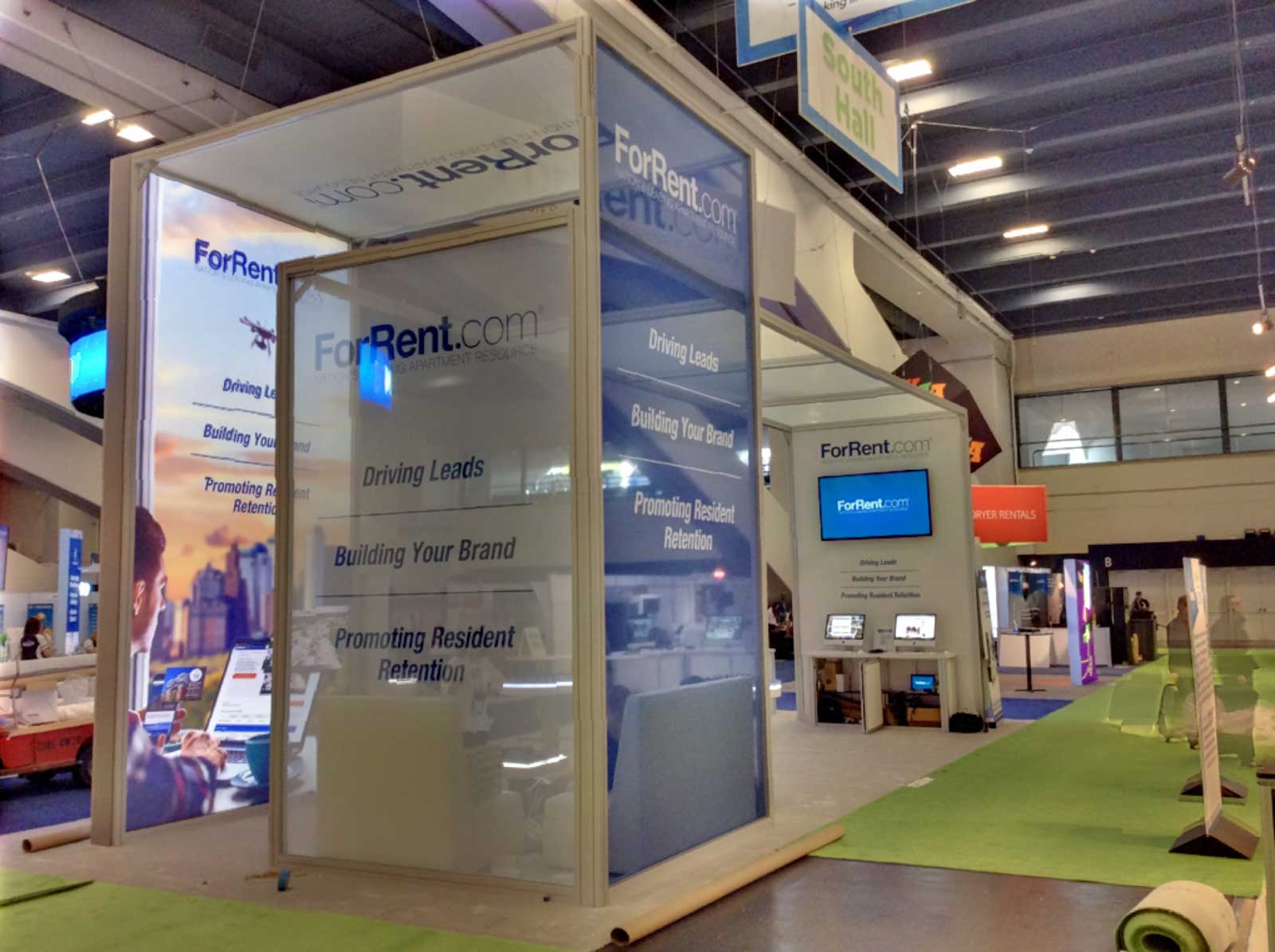 RENTAL: Custom Island with 16 ft. Structure, Conference & Storage Room, SEG Fabric Header Graphics, RE-1235 Counter, Halogen Arm Lights, Red Sintra Infill Panels, and RE-170 Literature Shelves