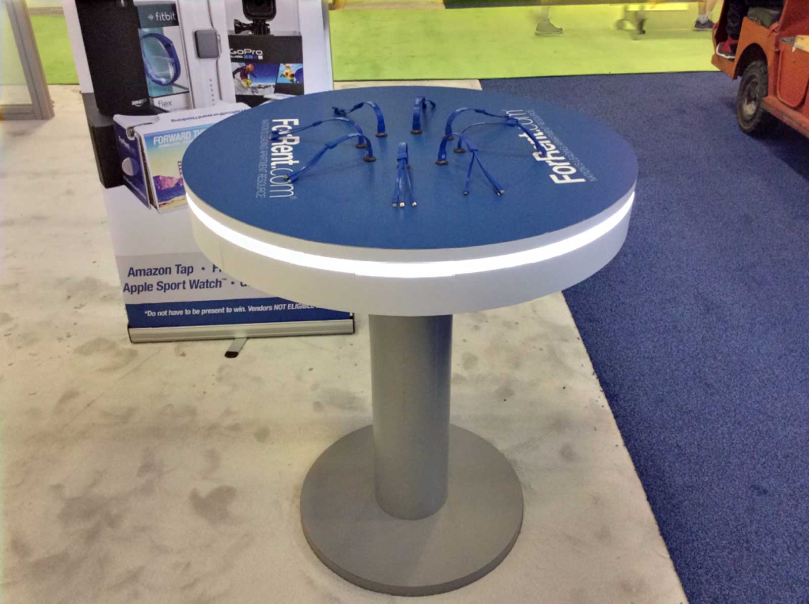 RENTAL: RE-1235 Half Circle Counter/Bar, RE-708 Charging Station Table, Sintra Infill Graphics for Counter, and Top Surface Vinyl Graphic for Charging Table RENTAL: RE-1235 Half Circle Counter/Bar Locking Storage RENTAL:  RE-708 Charging Station Table