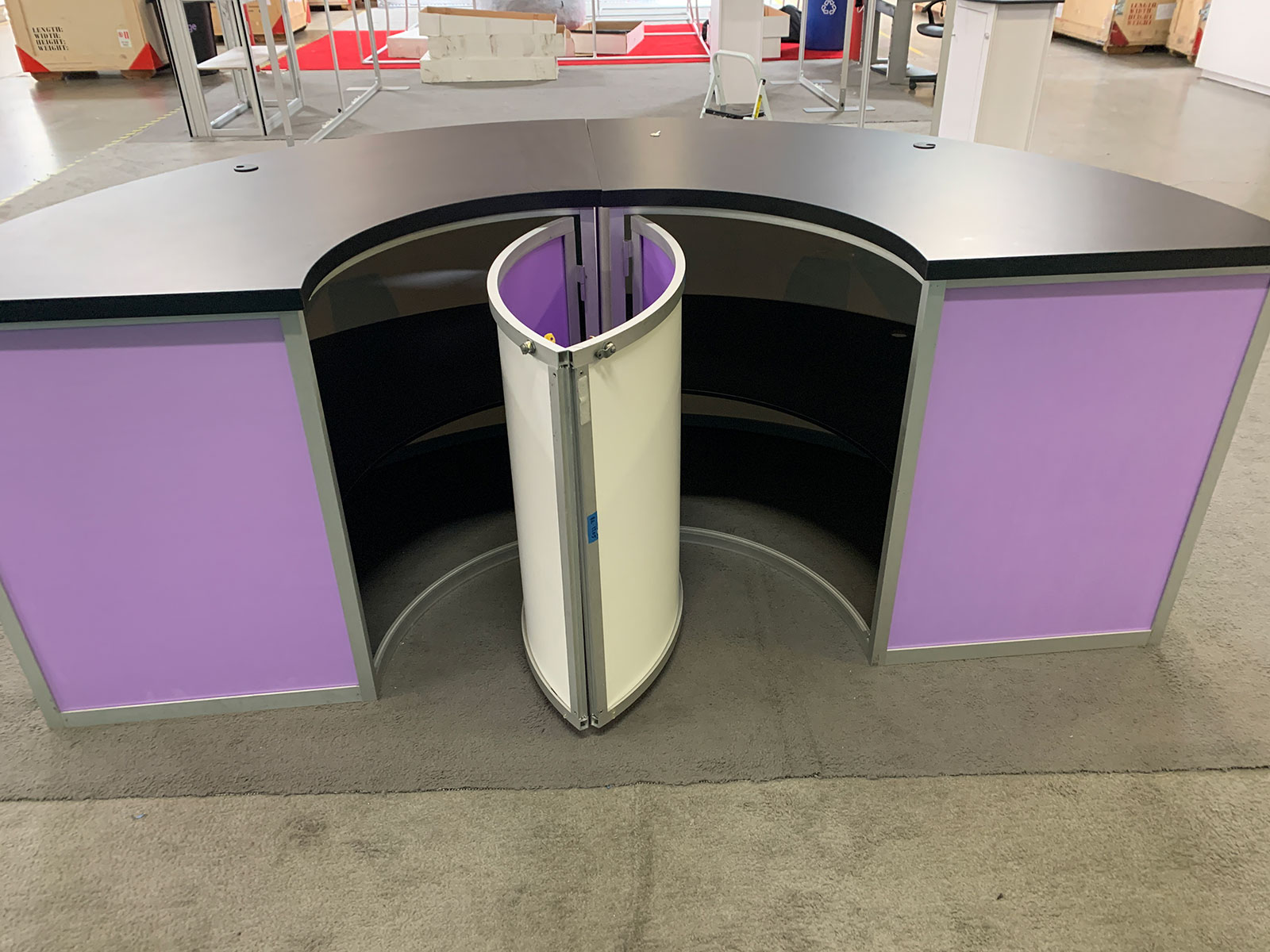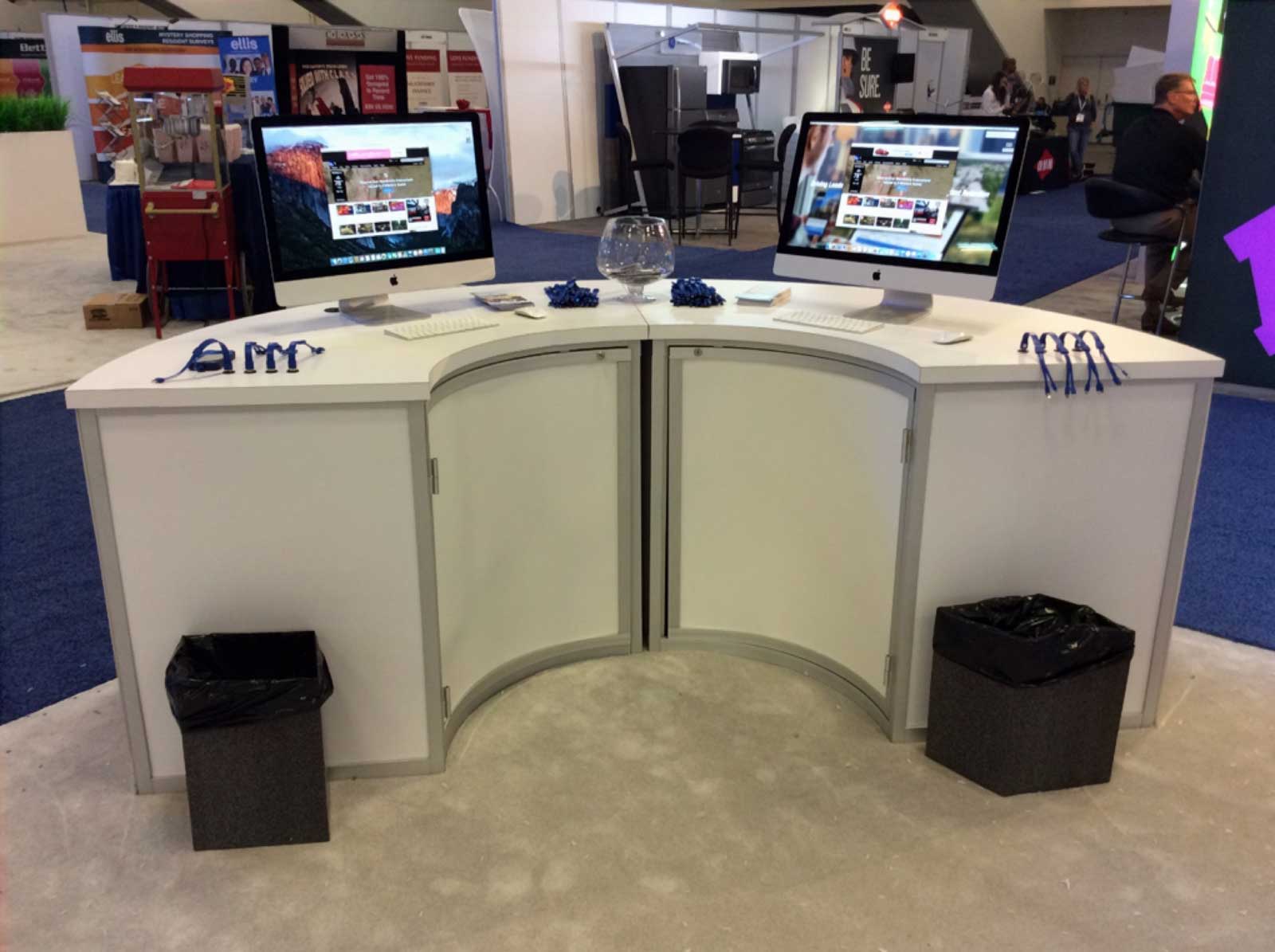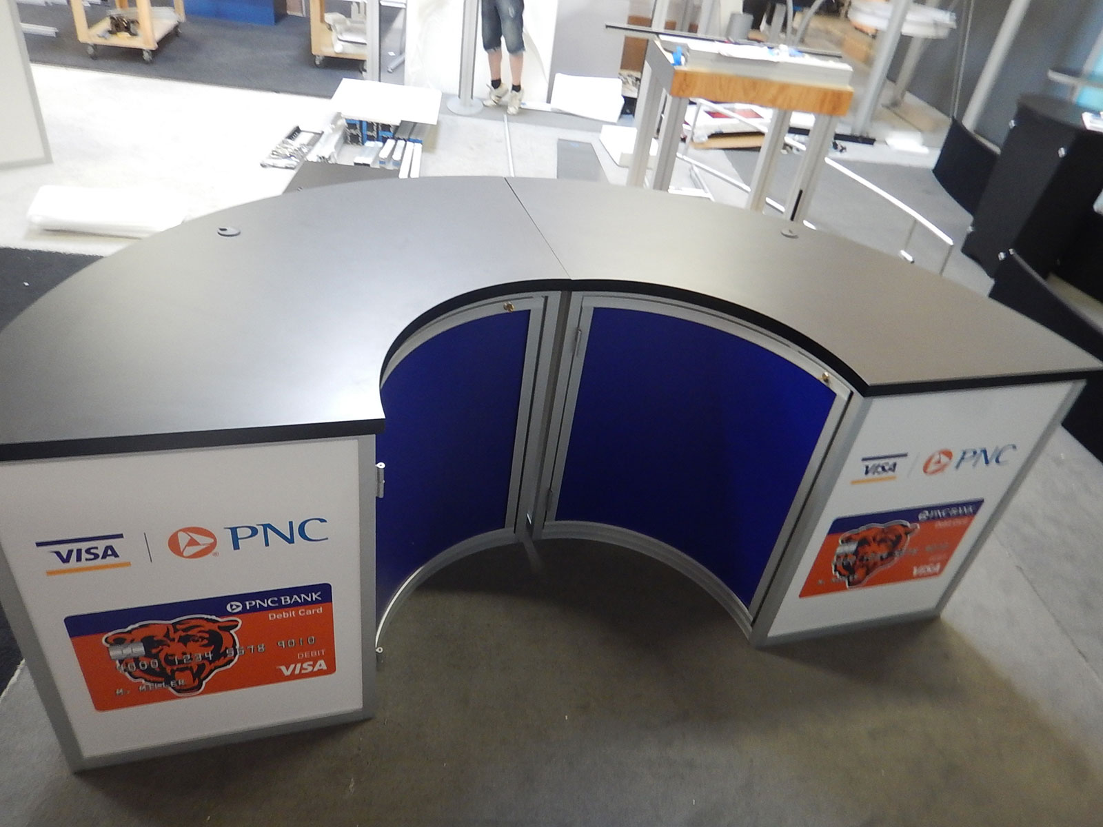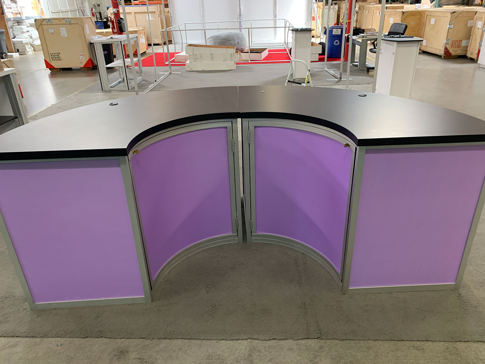 RENTAL: RE-1235 Half Circle Bar, RE-1202 Rectangular Counter with Direct Print Sintra Graphics. Trade Show Rental Counter Photos -- View 2 Trade Show Rental Counter Photos -- View 3 Trade Show Rental Counter Photos -- View 4 Trade Show Rental Counter Photos -- View 5