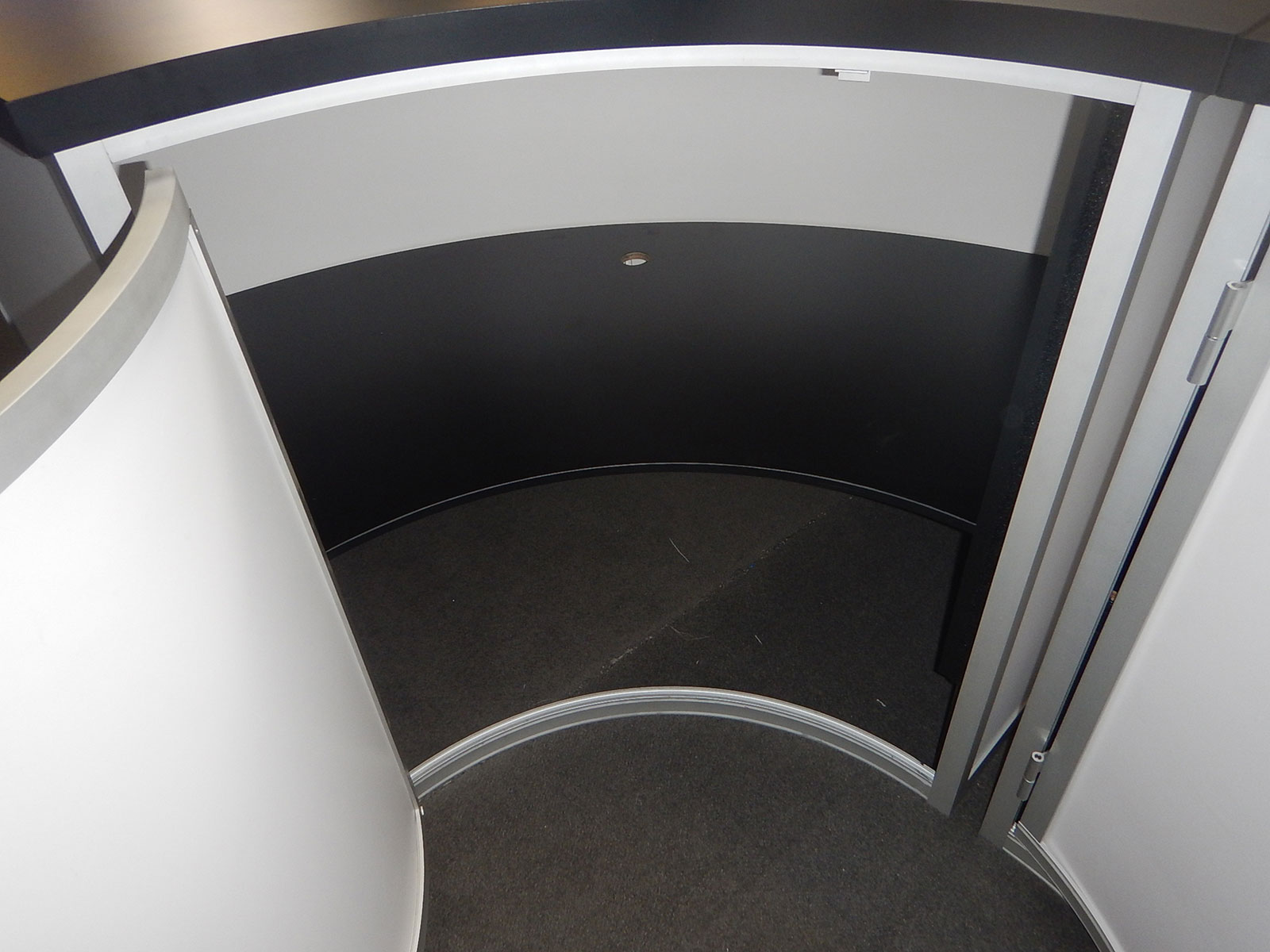 RENTAL: Conference Storage Room @ 230" Wide x 114" Deep x 95" High, with Locking Doors, White PVC Inserts for Interior Conference Room Walls, Large Monitor Mount, RE-1235 Half Circle Reception Counter/Bar with Black Laminated Tops, Interior Shelves, and L RENTAL: Conference Storage Room -- View 2 RENTAL: Conference Storage Room -- View 3 RENTAL: Conference Storage Room -- View 4 RENTAL: Conference Storage Room -- View 5 RENTAL: Conference Storage Room -- View 6