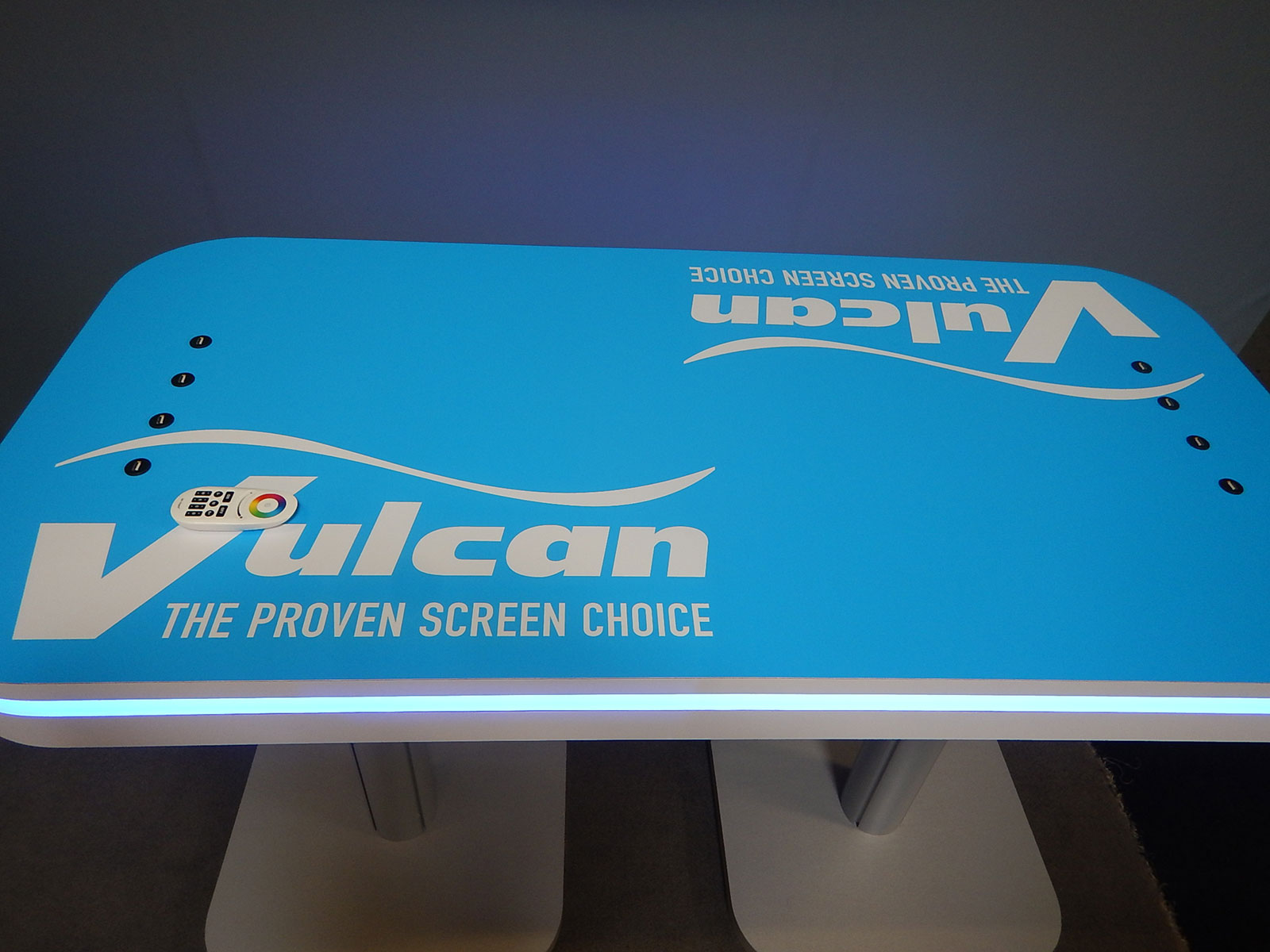 RENTAL: RE-1235 Half Circle Counter/Bar, RE-708 Charging Station Table, Sintra Infill Graphics for Counter, and Top Surface Vinyl Graphic for Charging Table