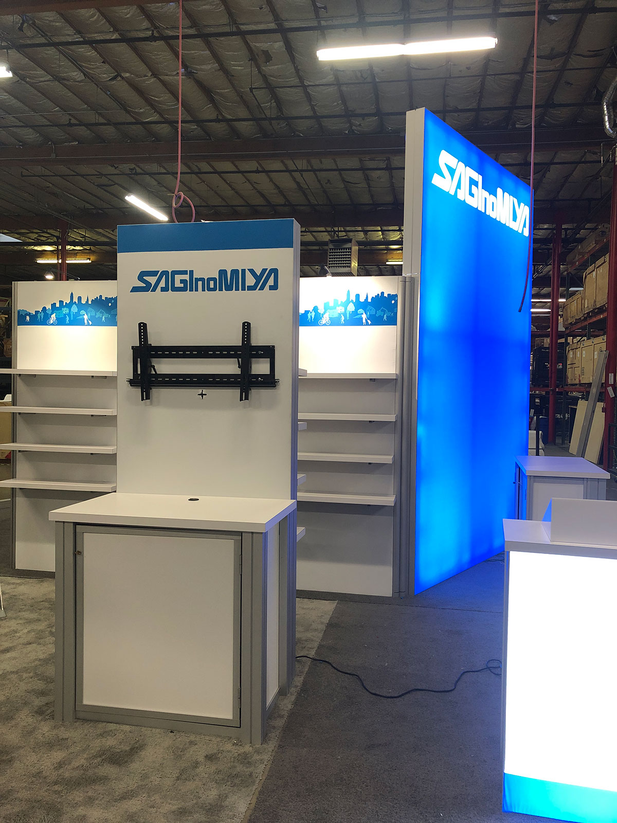 Workstation Kiosk, (12) White Laminated Shelves, and SEG Fabric