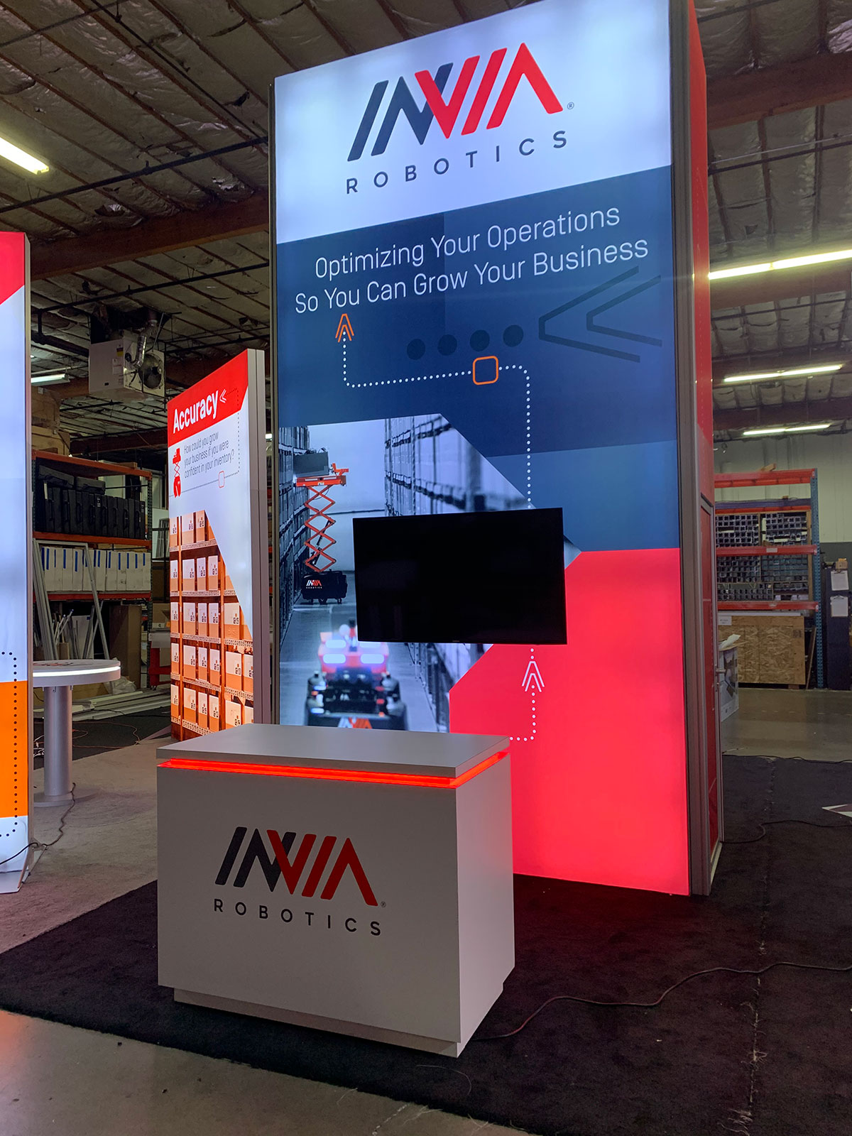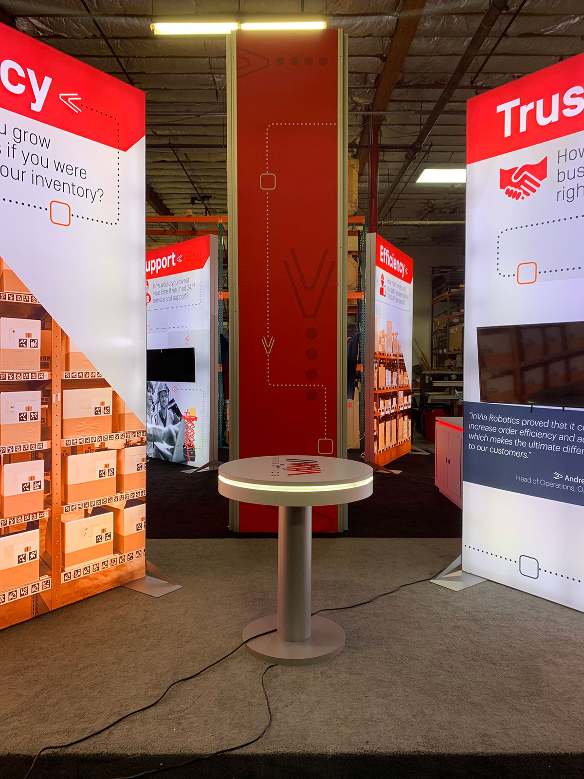 RENTAL: 16 ft Storage Closet Tower with Locking Door and Lightboxes on Front & Back, (4) 8’ ft. Wide x 12 ft. High Double-Sided Lightboxes, (2) RE-1576 Rectangular Counters with Recessed RGB LED Lighting, (2) RE-704 Charging Station Tables with USB Char Island Rental Exhibit Island Rental Exhibit Island Rental Exhibit