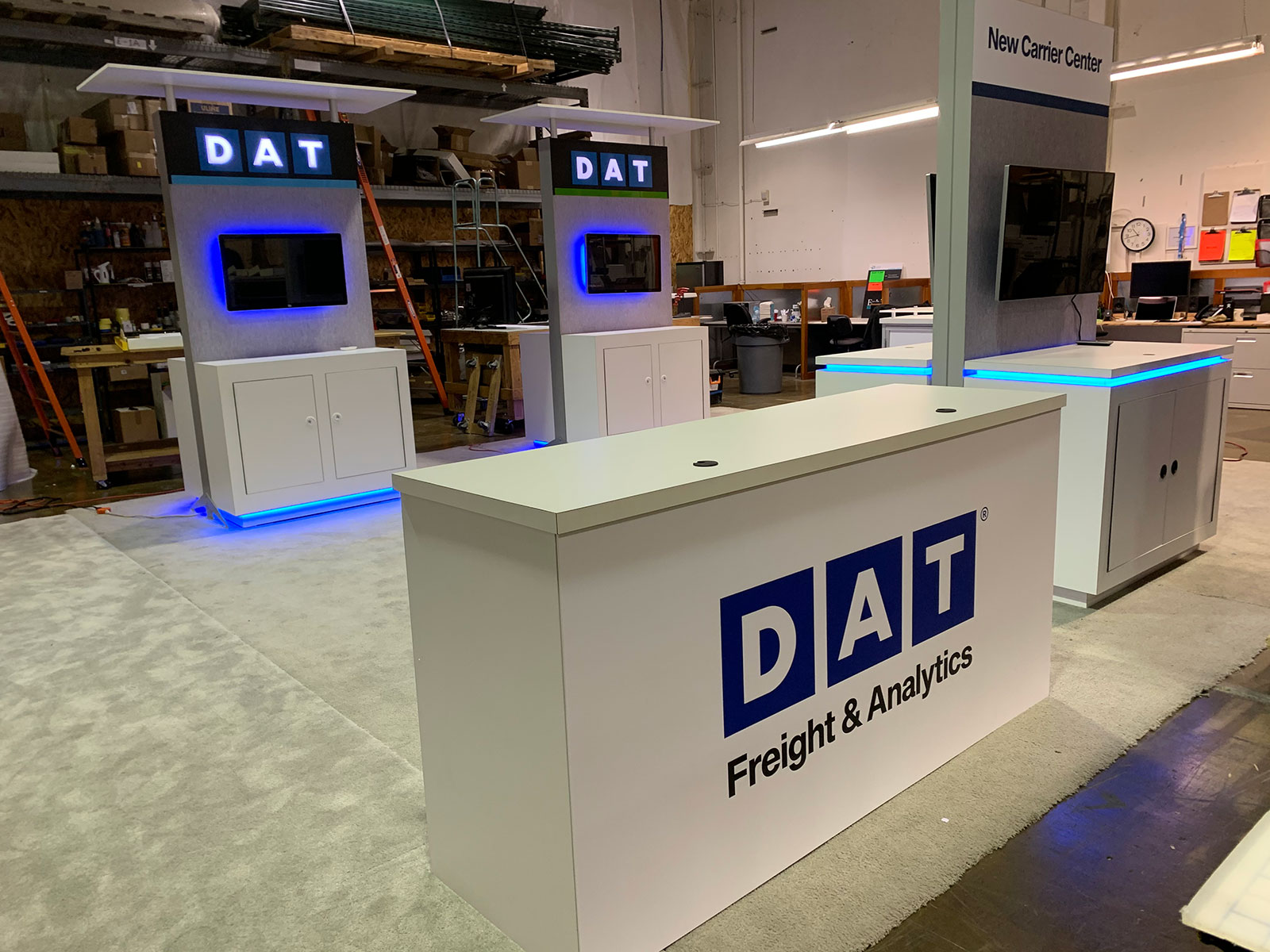 RENTAL: 16 ft. Storage Closet Tower with Locking Door and Lightboxes on Front & Back, (4) 8 ft. Wide x 12 ft. High Double-Sided Lightboxes, (2) RE-1576 Rectangular Counters with Recessed RGB LED Lighting, (2) RE-704 Charging Station Tables with USB Charging Ports, (8) Large Monitor Mounts for Corner Lightboxes, (2) Large Monitor Mounts for Tower, (8) 43" Monitors, (2) 55" Monitors, SEG Fabric Graphics, and Direct Print Sintra Graphics