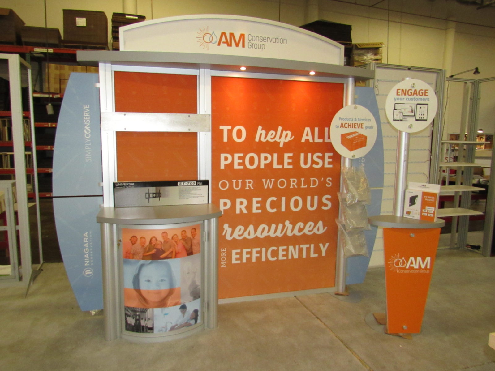 VK-1032 Hybrid Trade Show Exhibit, Engineered Aluminum Structure, Arched Header, (3) ZB-221 Metal Literature Holders, Large Format Tension Fabric Graphics, (2) Puck Lights, Backwall Counter with Locking Storage and Shelf, MOD-1177 Workstation with Monitor Mount [54399]