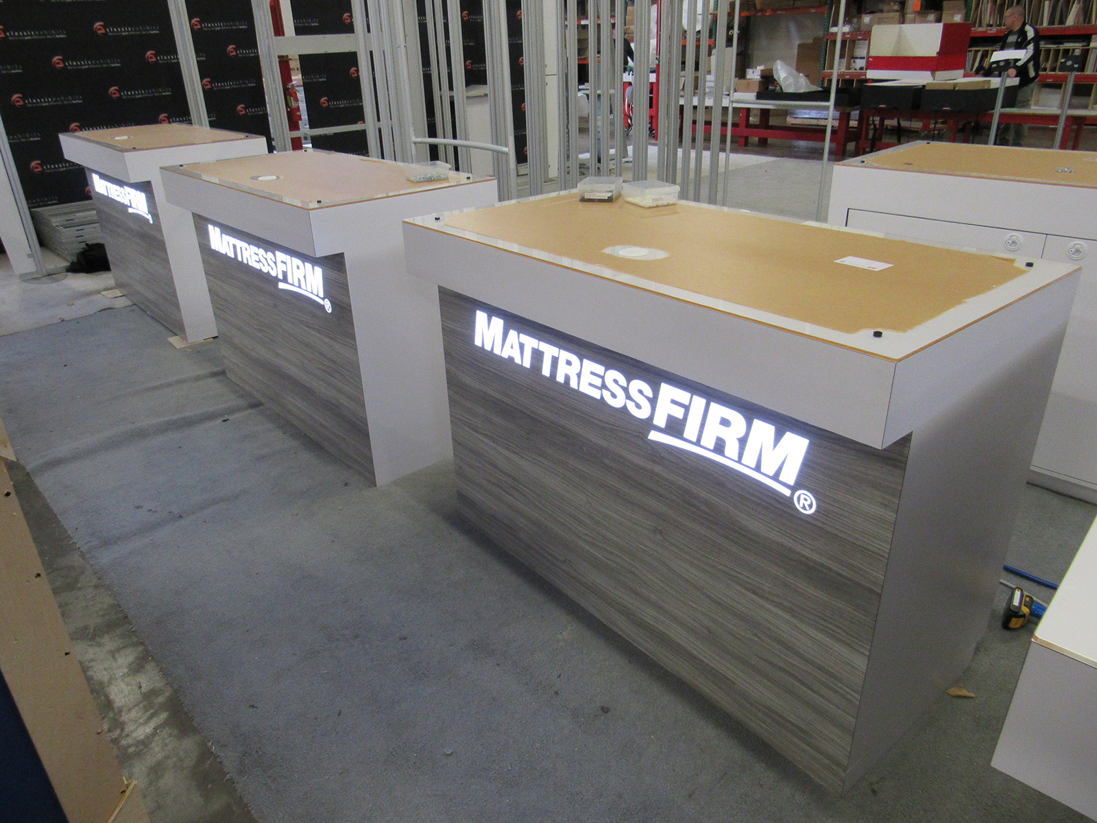 (5) Custom Reception Counters with Backlit Graphics, Wireless Charging, and Locking Storage (5) Custom Reception Counters with Backlit Graphics, Wireless Charging, and Locking Storage