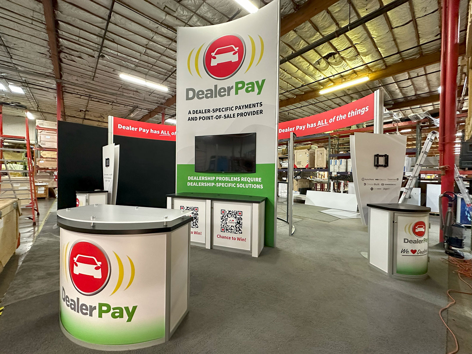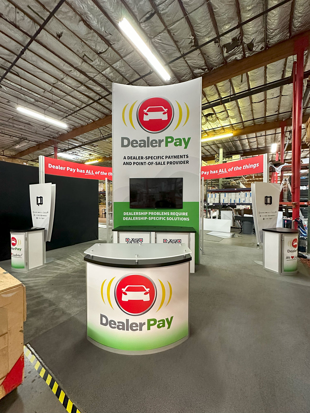 RENTAL: Modified RE-9120 Island Design with Curved Gravitee System Tower, Curved Extrusion Header, Semi-Private Meeting Area with Clear Acrylic Panels, RE-1207 Large Rectangular Counter, (2) Workstation Kiosks with RE-1221 Counters, RE-1250 Reception Counter, (3) Monitor Mounts, SEG Fabric Graphics, and Direct Print Sintra Graphics.