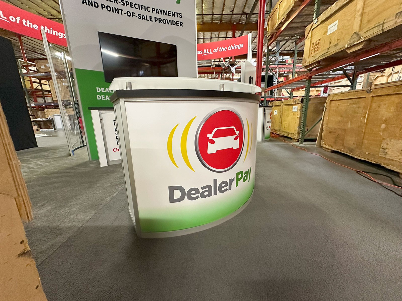 RENTAL: Modified RE-9120 Island Design with Curved Gravitee System Tower, Curved Extrusion Header, Semi-Private Meeting Area with Clear Acrylic Panels, RE-1207 Large Rectangular Counter, (2) Workstation Kiosks with RE-1221 Counters, RE-1250 Reception Coun RENTAL: Modified RE-9120 Island Design with Curved Gravitee System Tower -- Image 2 RENTAL: Modified RE-9120 Island Design with Curved Gravitee System Tower -- Image 3 RENTAL: Modified RE-9120 Island Design with Curved Gravitee System Tower -- Image 4 RENTAL: Modified RE-9120 Island Design with Curved Gravitee System Tower -- Image 5 RENTAL: Modified RE-9120 Island Design with Curved Gravitee System Tower -- Image 6