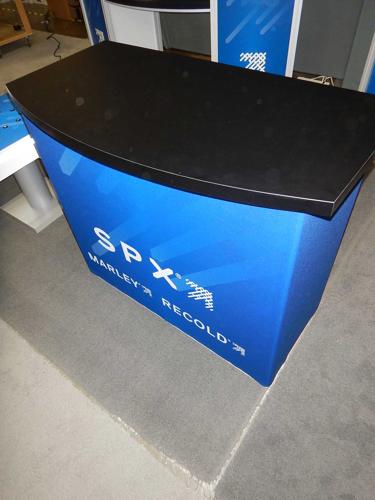 RENTAL Counters, Charging Stations, and Monitor Stands RENTAL: RE-703 Charging Stations with Graphics RENTAL: (2) Custom Dual Pedestal Counters with Bridged Curved Tops RENTAL: (1) RE-1558 Gravitee Reception Counter with SEG Fabric Wrap RENTAL: (4) RE-706 Charging Stations with 42" Monitors