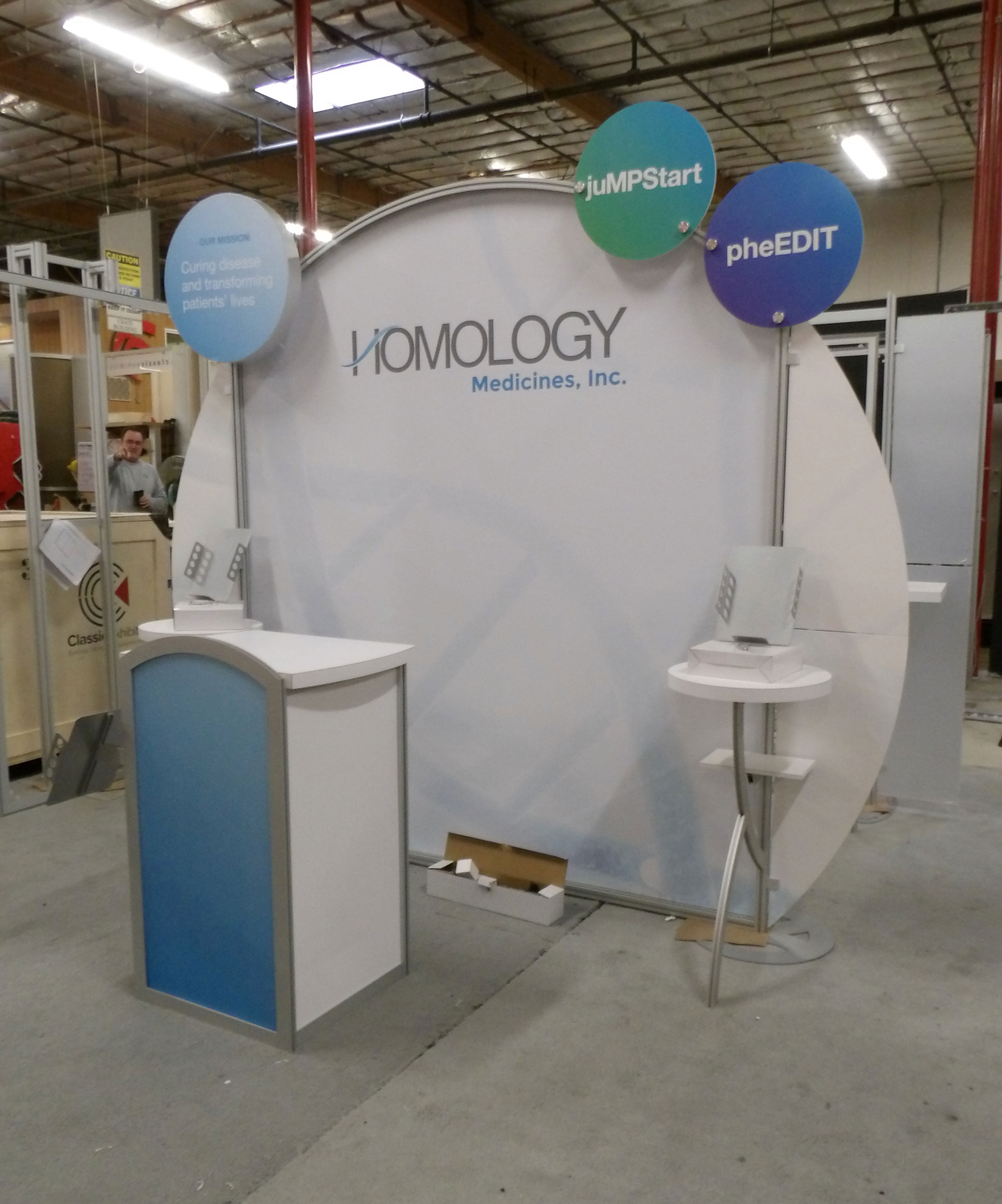 VK-1126 Hybrid Exhibit with Backwall Workstations, Floating Graphics, Fabric Graphics, Monitor Mounts, Backlit Circle Sign, Literature Holders, and a MOD-1297 Portable Pedestal with Locking Storage [59491]