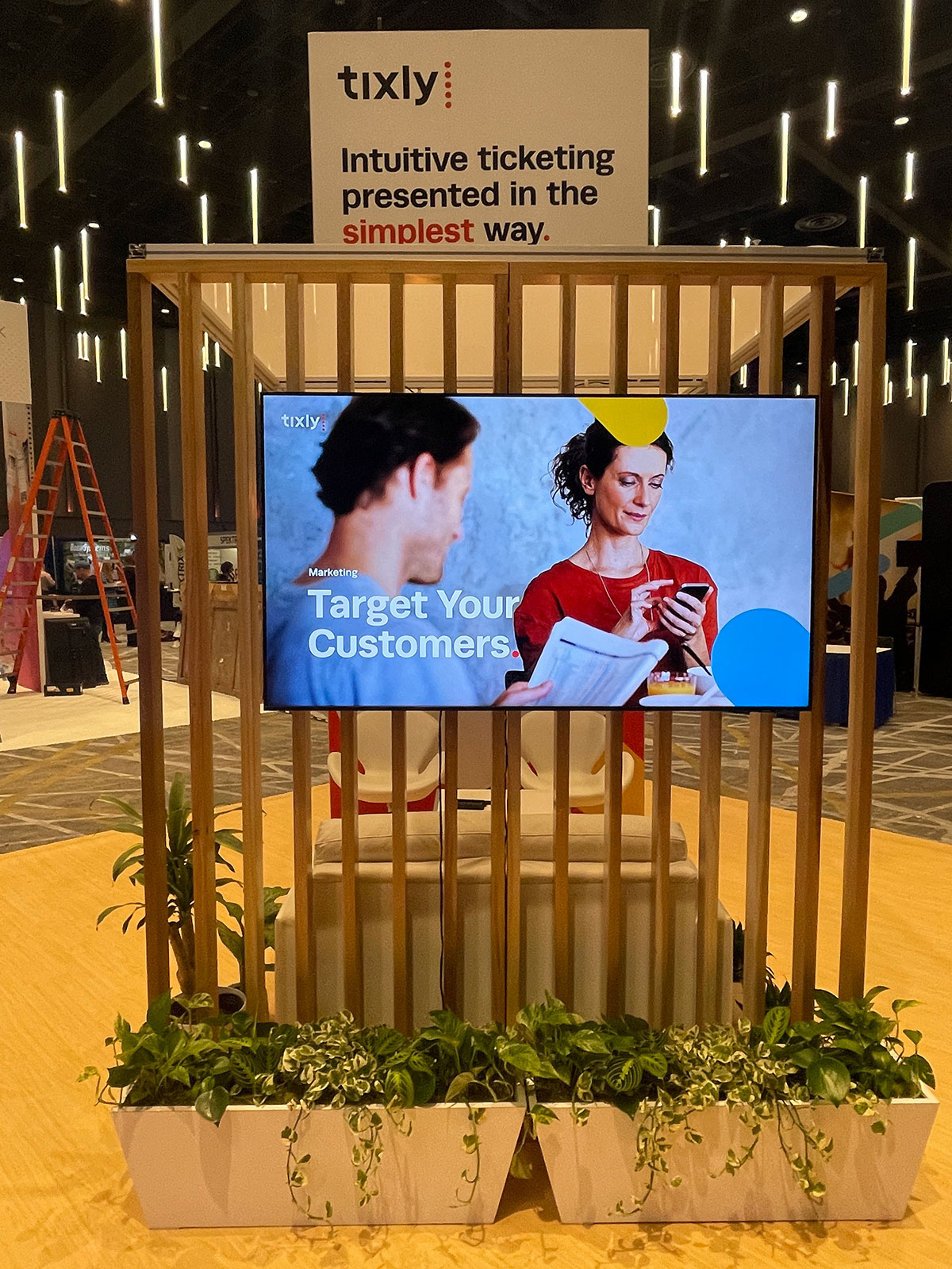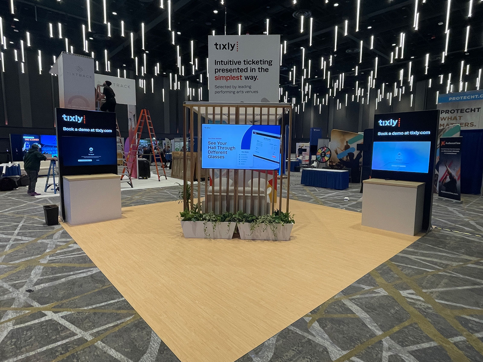 RENTAL: Island Design with 16 ft High Storage Tower with Locking Door, (2) Double-Sided 4 ft x 8 ft Lightbox Kiosks, (2) RE-1202 Workstation Counters for Kiosks, Canopy Structure with Custom Wood Support Wall, (2) White Laminated Planter Boxes, (3) Large Monitor Mounts, (2) 48 inch Monitors, and (1) 65 inch Monitor, and SEG Fabric Graphics