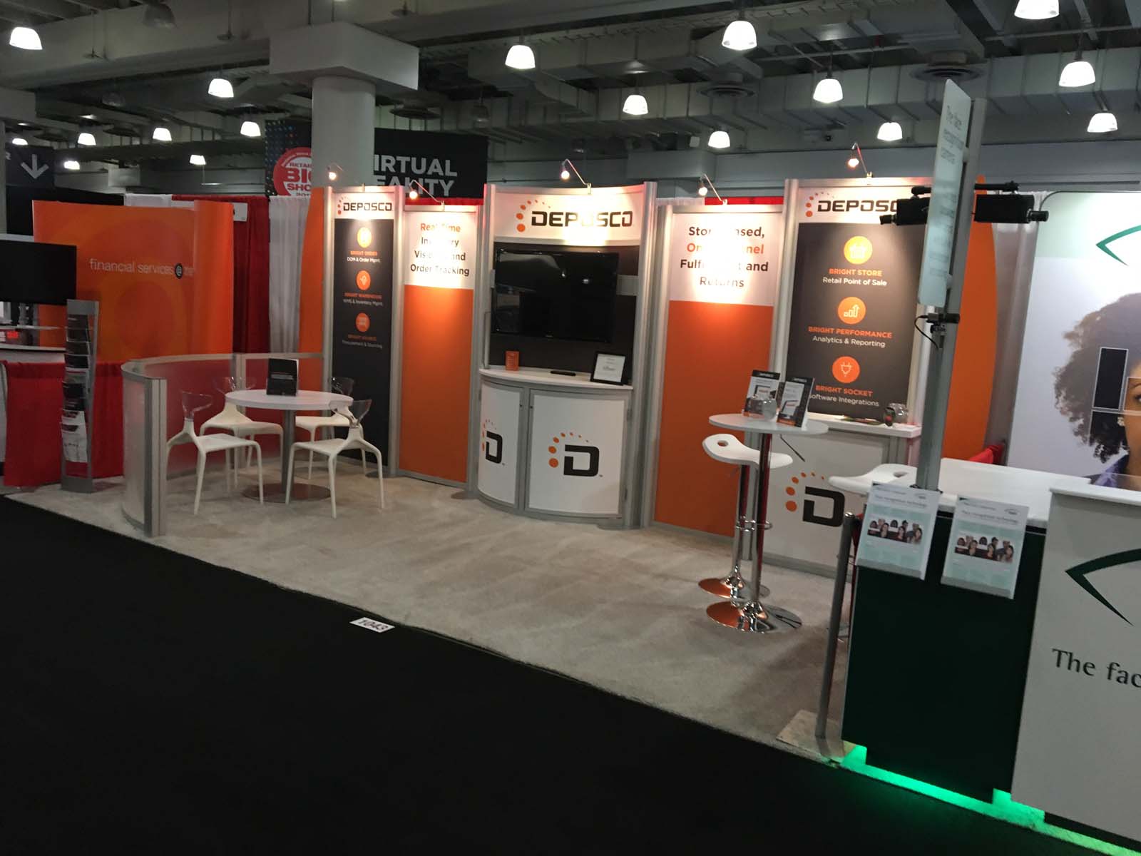 RENTAL: Custom Inline with Built-in Curved Counter, Modified RE-1227 Attached Counter, Curved Short Return Wall with Frosted Acrylic, (5) Arm Lights, Large Monitor Mount, Tension Fabric and Sintra Graphics.