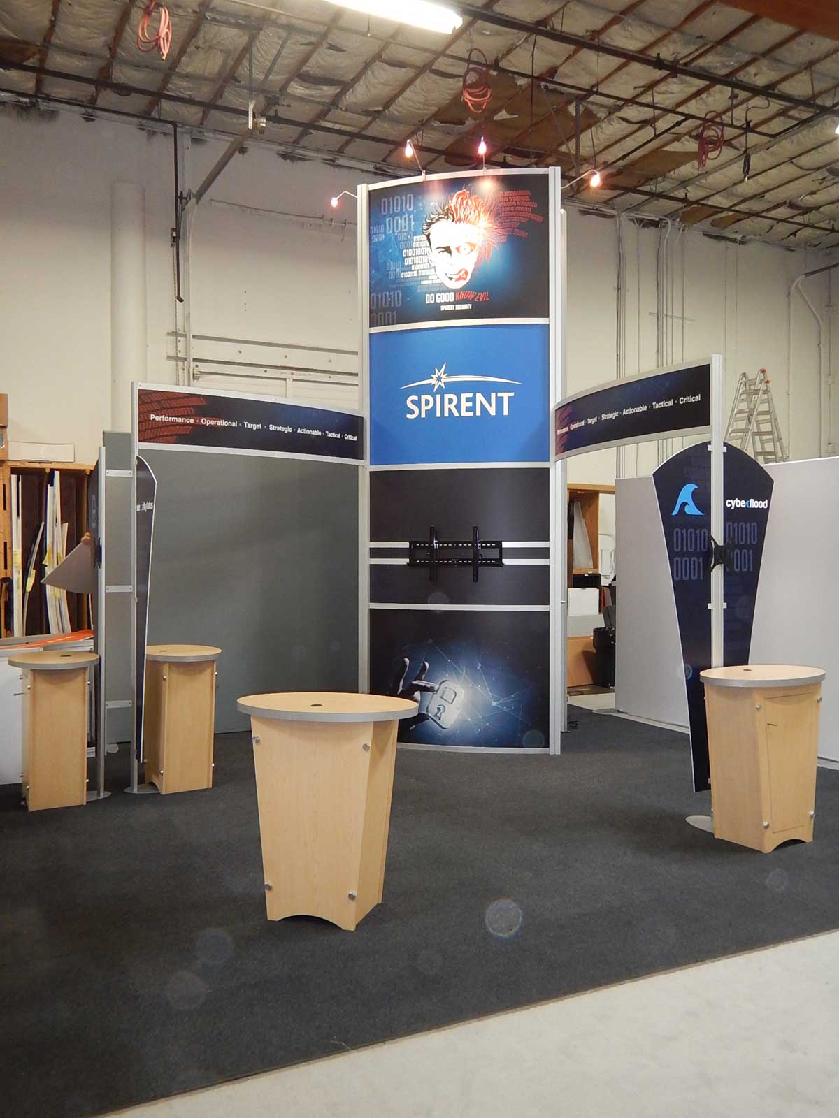 RENTAL: Modified RE-9066 Island with 16' High Tower with Locking Door RENTAL: 10 ft x 3 ft. High Square Hanging Sign with Pillowcase Fabric Graphic RENTAL:  (1) Double-Sided Kiosk RENTAL: (1) Double-sided Kiosk RENTAL:  RE-1201 Reception Counter