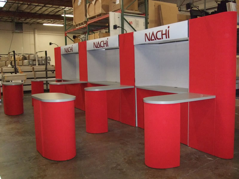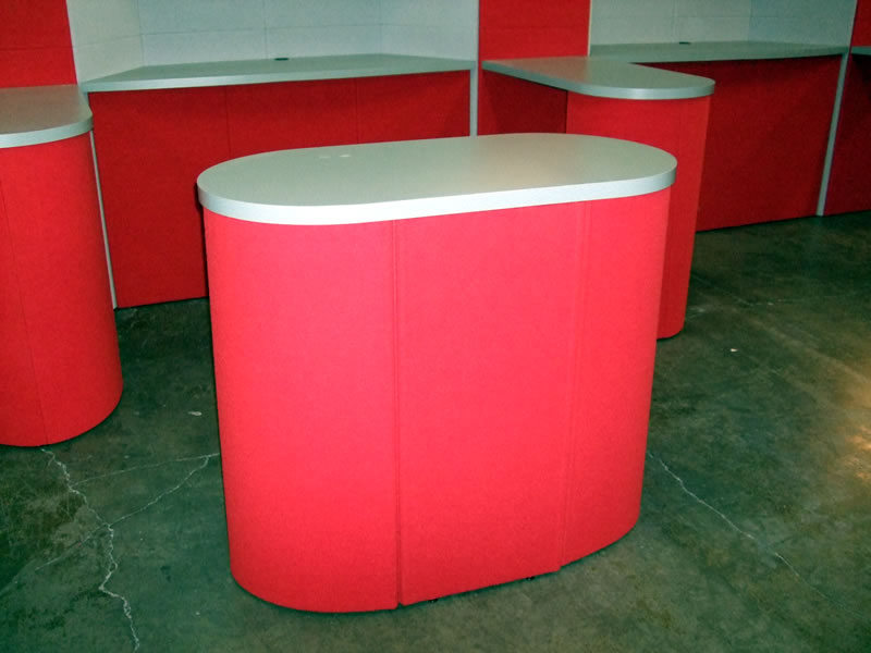 Intro Fabric Portable Trade Show Display: 10' x 30" Inline Exhibit with Red Fabric and DI-618 Oval Counter.