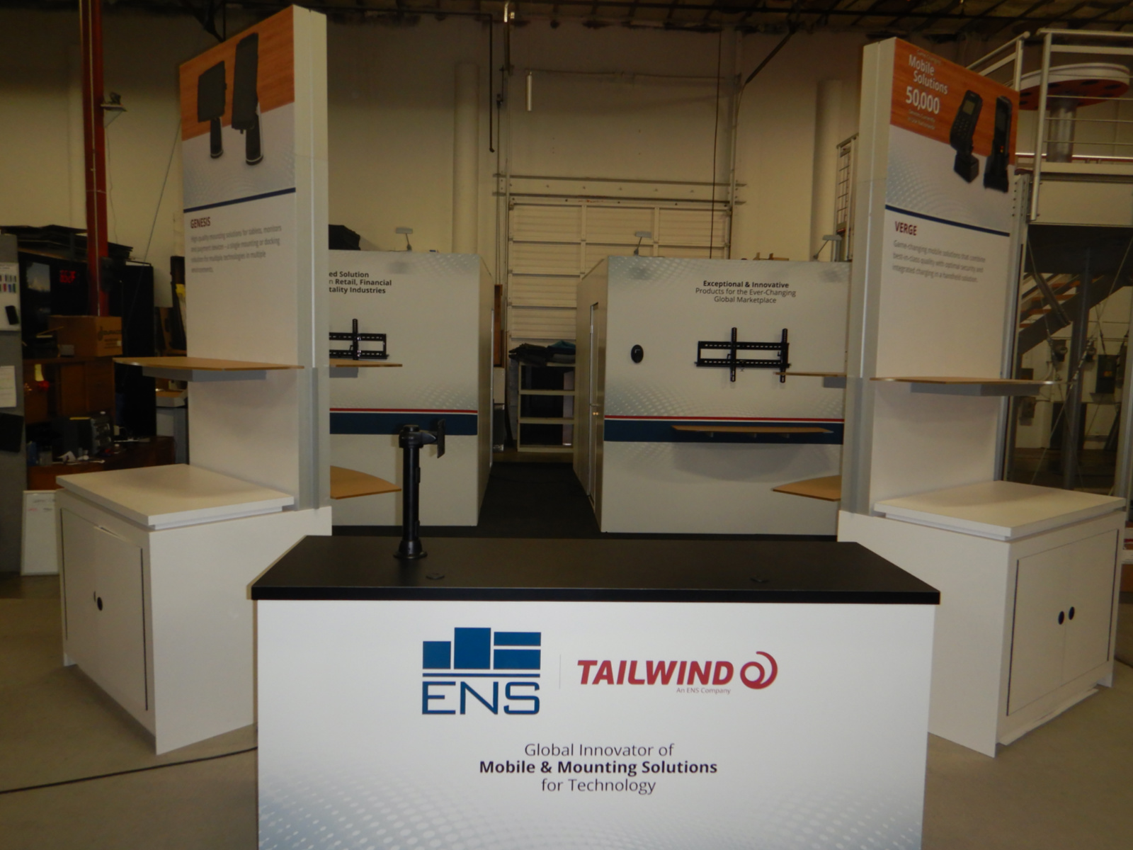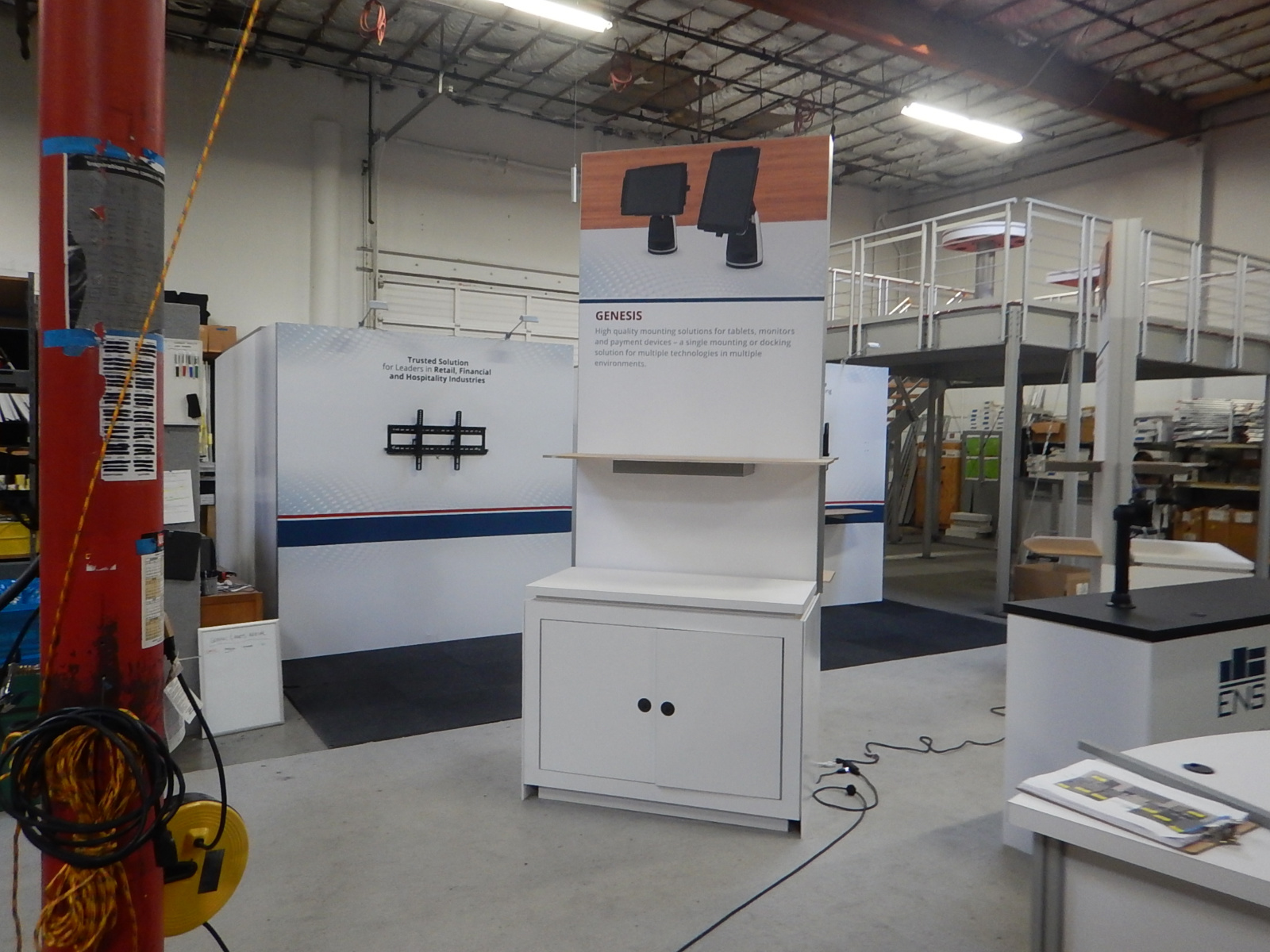 White Laminated Counters Custom Island Rental Design Custom Island Rental Design Custom Island Rental Design Double-Sided Graphic Kiosks Storage Room with Locking Doors