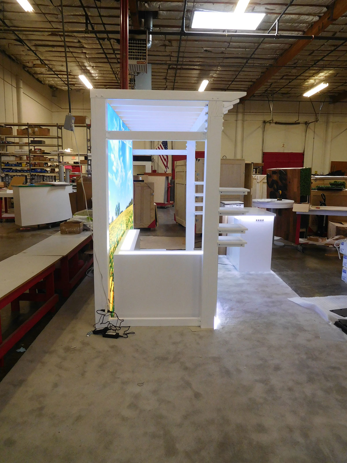Custom Exhibit with Pergola, Product Shelves, Benches, LED Lightbox, Perimeter Accent Lights, and Counter with Storage and Standoff Graphic Side View Custom Counter with Standoff Graphic and Storage Custom Exhibit with Pergola, Product Shelves, Benches, LED Lightbox, Perimeter Accent Lights