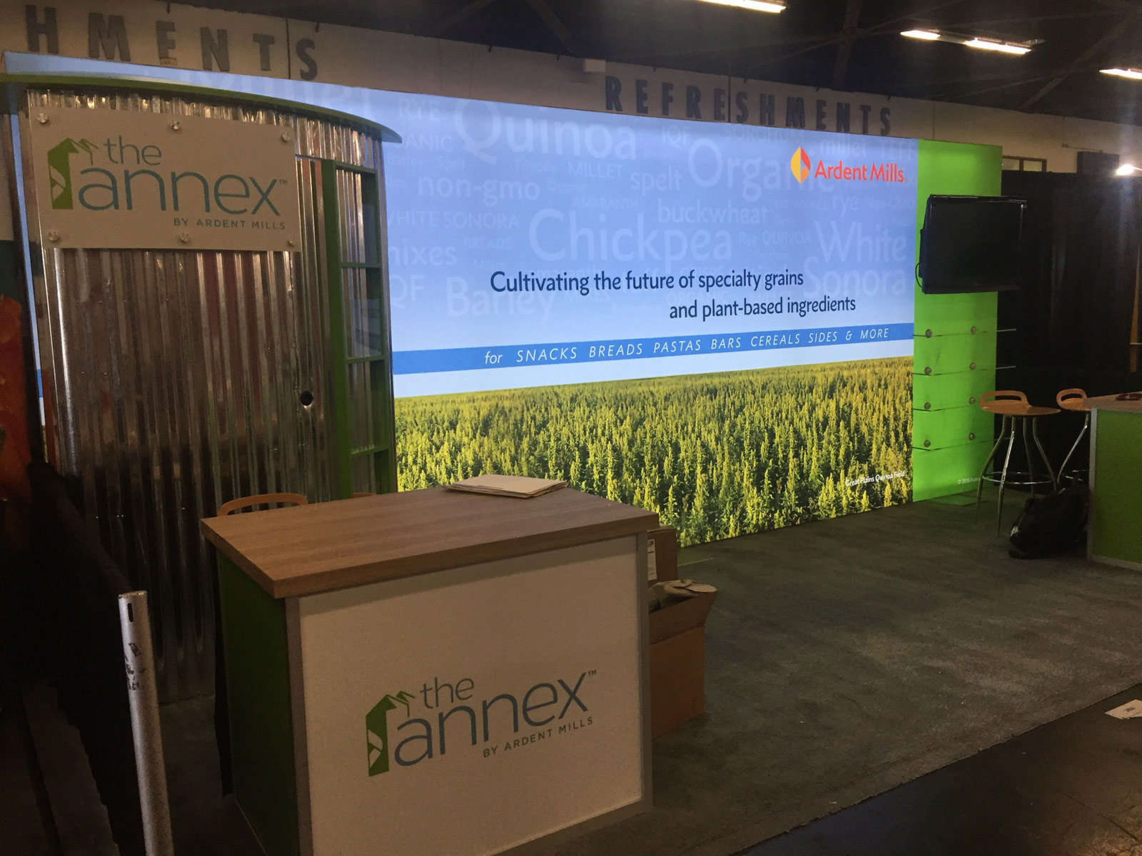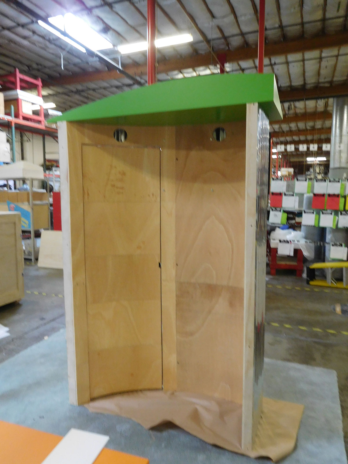 Custom Wood Construction with Corrugated Steel Cladding, (4) Literature Pockets, Standoff Graphic, Ceiling, and Door Interior View Show booth with LED Lightbox