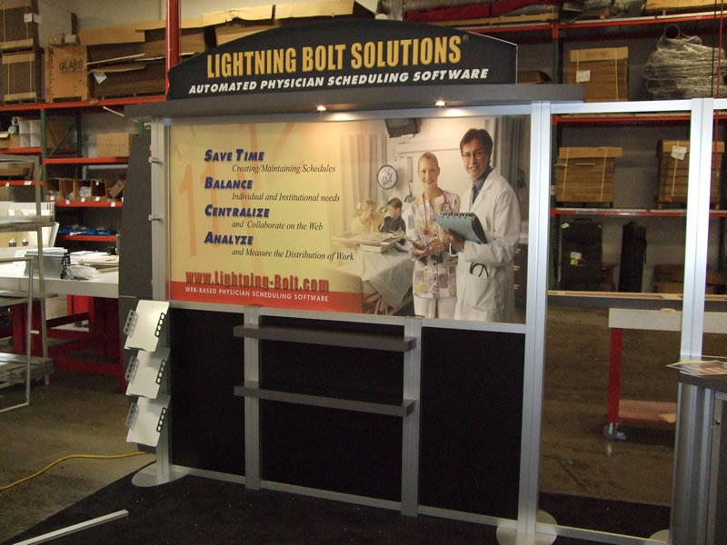 Comment: Note the versatility of this kit with multiple literature holders, shelves, downlighting, workstations, storage, monitor mount options, and large tension fabric graphics.