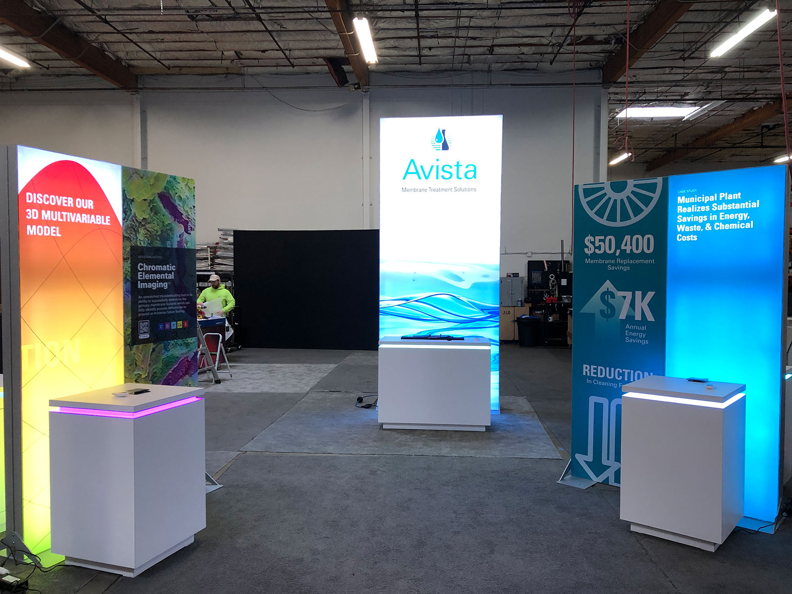 RENTAL: (1) 5 ft. Wide x 12 ft. High Double-Sided Lightbox, (2) 5 ft. Wide x 8 ft. High Double Framed Kiosks with One Backlit and One Non-Backlit, (4) RE-1575 White Laminated Counters with Recessed LED/RGB Lighting, (1) RE-1576 White Laminted Counter with Recessed LED/RGB Lighting, SEG Fabric Graphics, and Vinyl Applied Graphics
