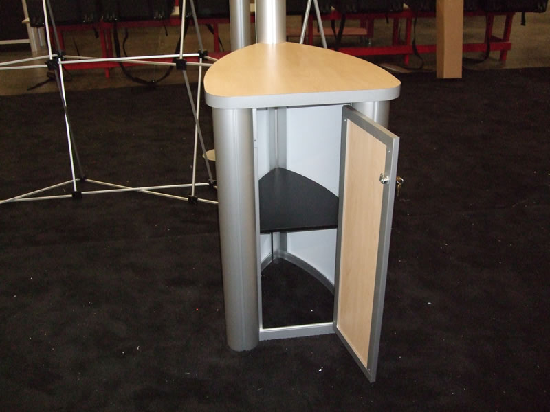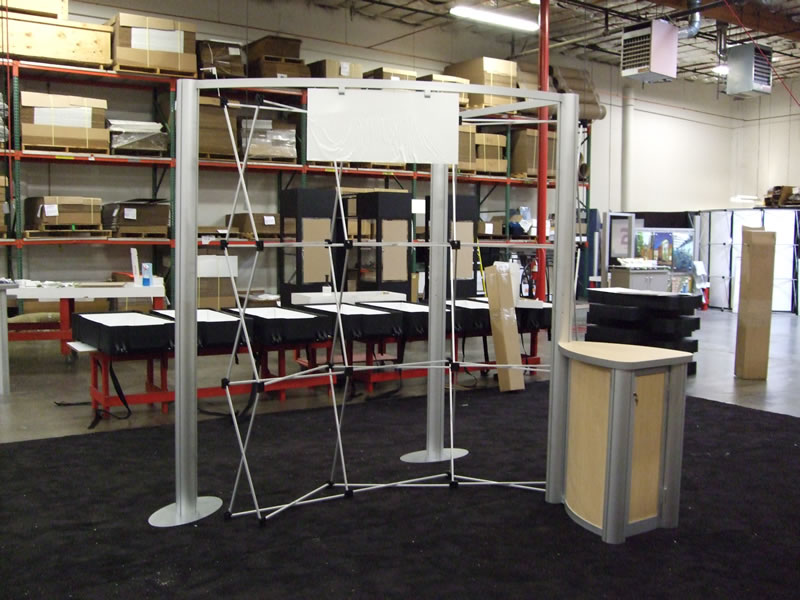 Comment: The designs shown incorporate the Quadro Pop Up into a modular laminate or a hybrid exhibit design. In the first exhibit, the client uses showcases, a header, and a flat frame pop up. In the second, the pop up frame gains additional depth by adding overhead extrusion and a combination workstation/pedestal.