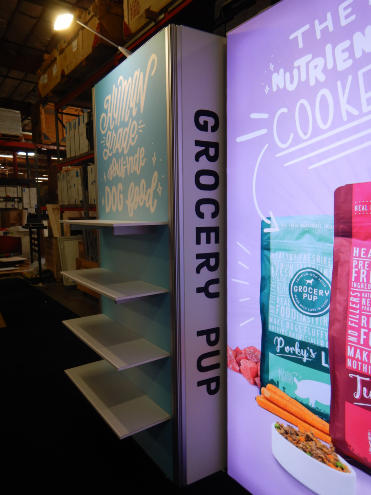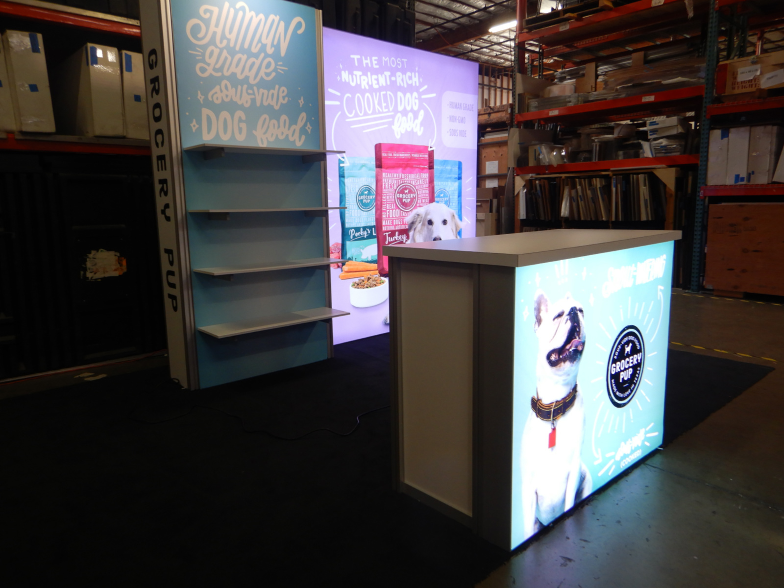 RENTAL: Includes RE-1062 Gravitee One-Step System Design with Lightbox, (4) White Laminated Shelves with Extrusion Supports, LED Arm Light, RE-1567 Gravitee One-Step Reception Counter, and Silicone Edge Fabric Graphics