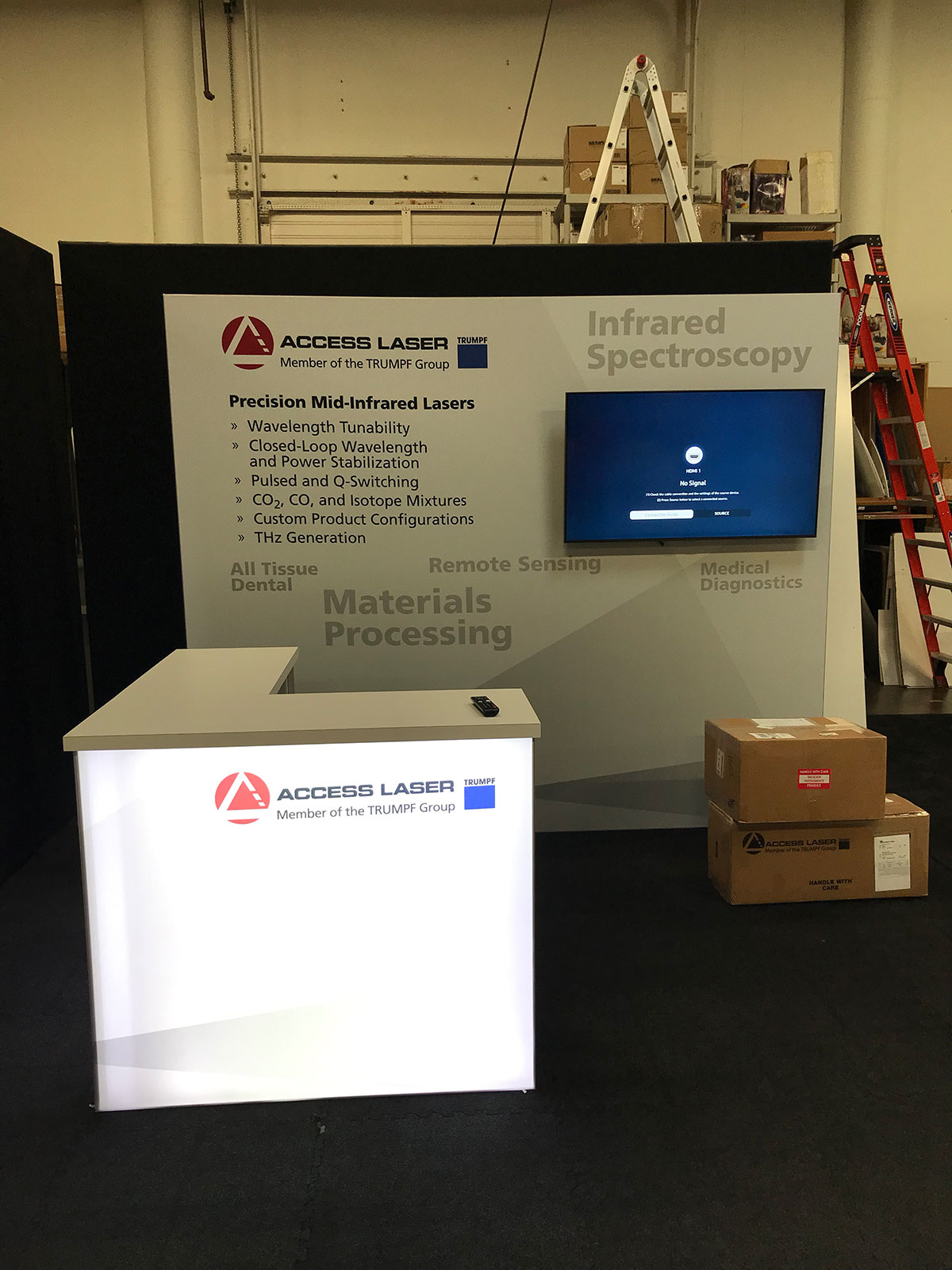 RENTAL: RE-1080 SEGUE Design with Boomerang Baseplates, Large Monitor Mount, RE-1572 Backlit L-Shaped Counter, 50" Monitor, and SEG Fabric Graphics. RENTAL: RE-1080 SEGUE Design with Boomerang Baseplates, Large Monitor Mount, RE-1572 Backlit L-Shaped Counter, 50" Monitor, and SEG Fabric Graphics. RE-1572 Backlit Counter with Locking Storage RE-1572 Backlit Counter with Locking Storage