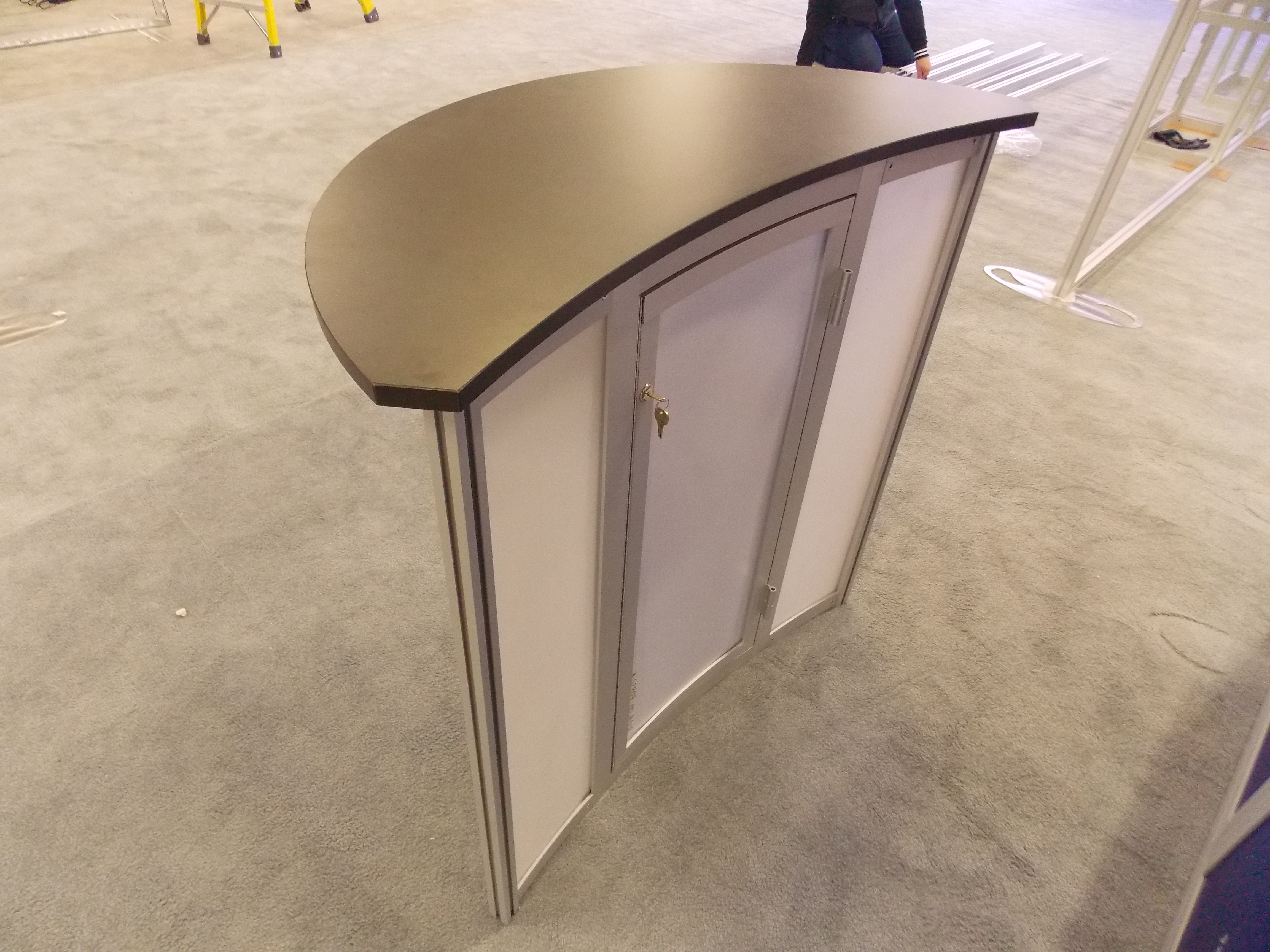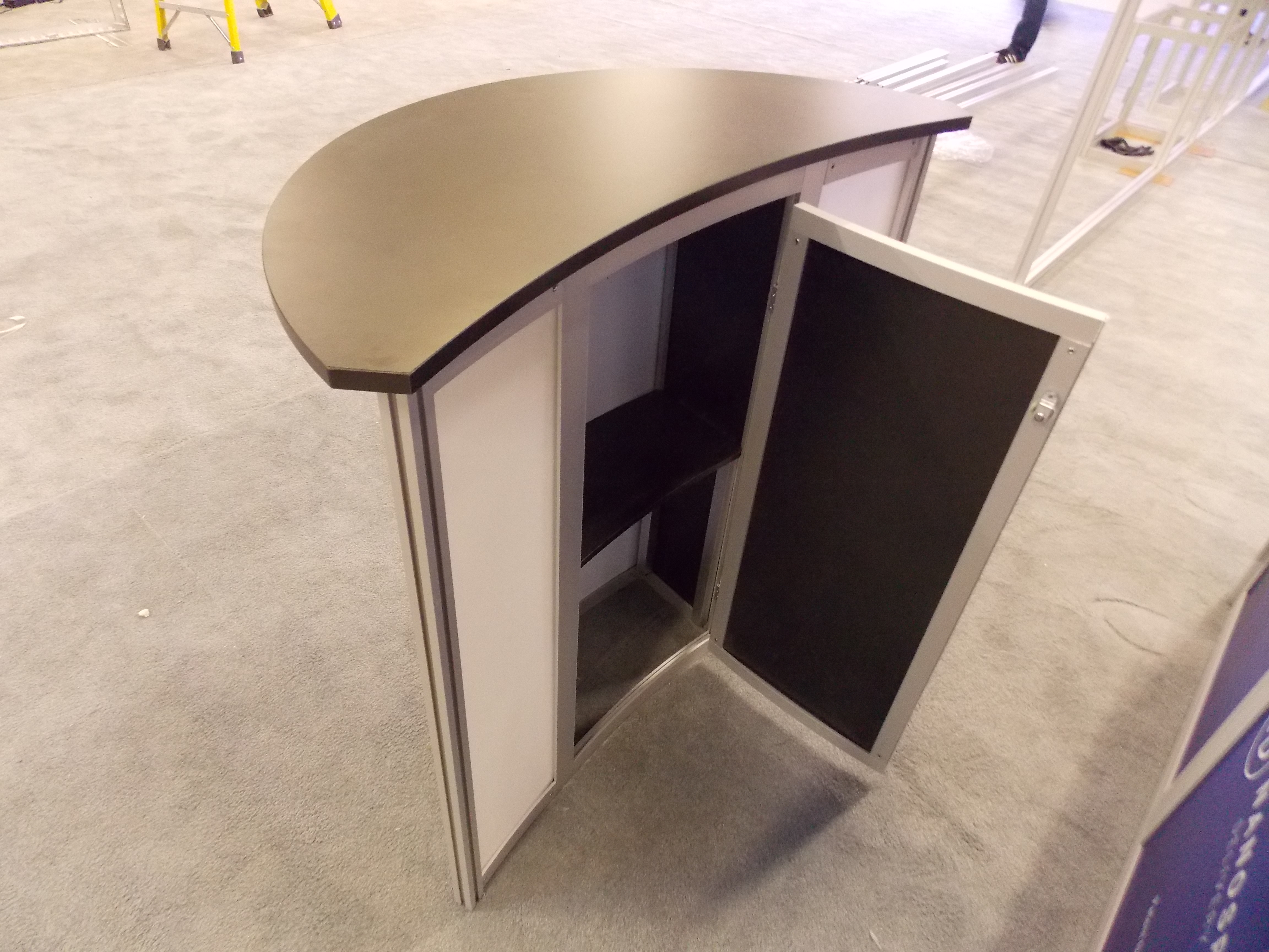 ecoSmart ECO-1044 Sustainable Exhibit, Lightweight Recycled Aluminum Frames, Backwall Counter with Locking Storage, (2) Adjustable Shelves, Curved Canopies, Oval Header Graphic and ECO-5C Podium with Eco-Board Graphic [52909]