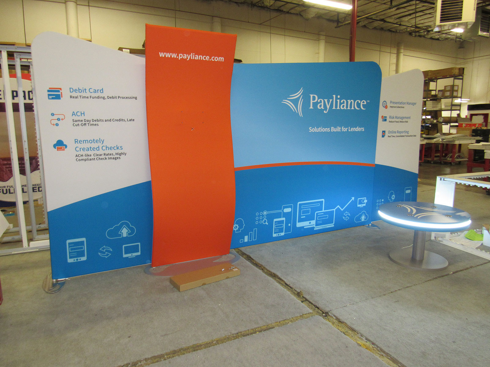 Modified ECO-2120 Sustainable Hybrid Display with Aluminum Frame, Eco-Friend Recycled Fabric Graphics, Large Monitor Mount, and MOD-1452 Charging Coffee Table [56763]