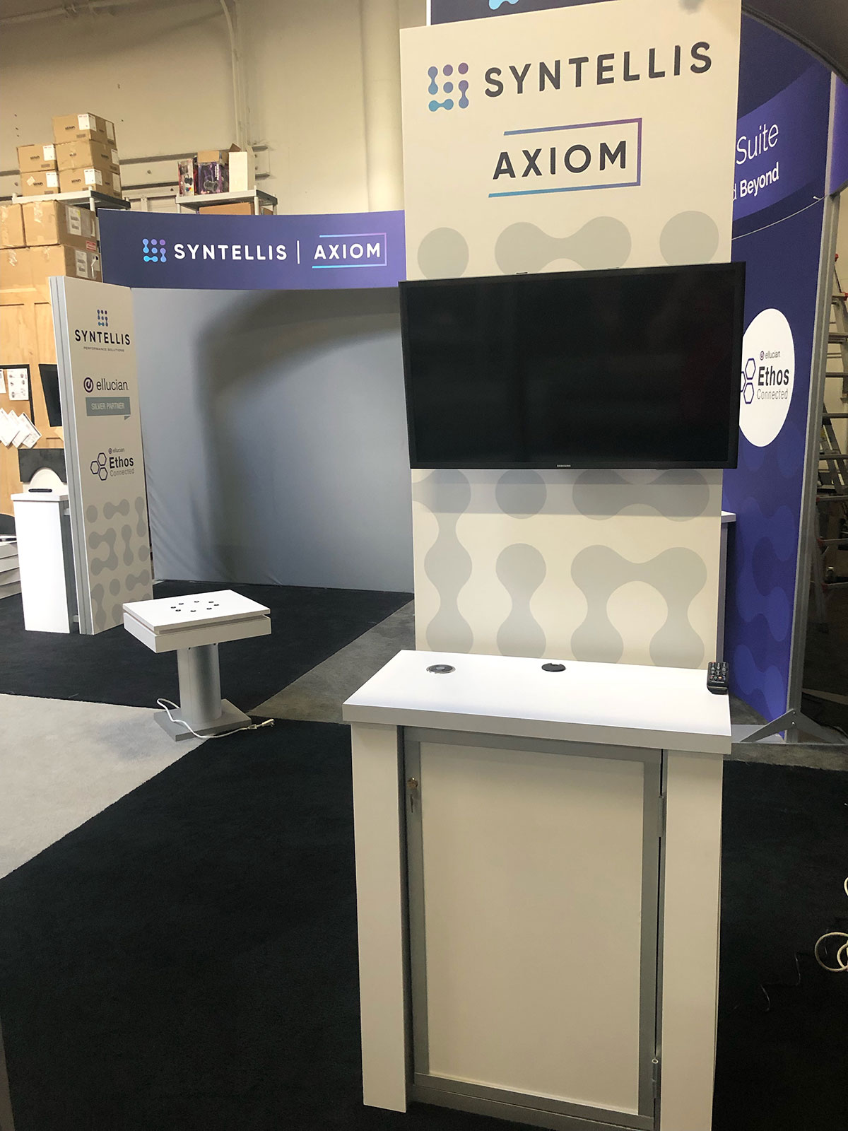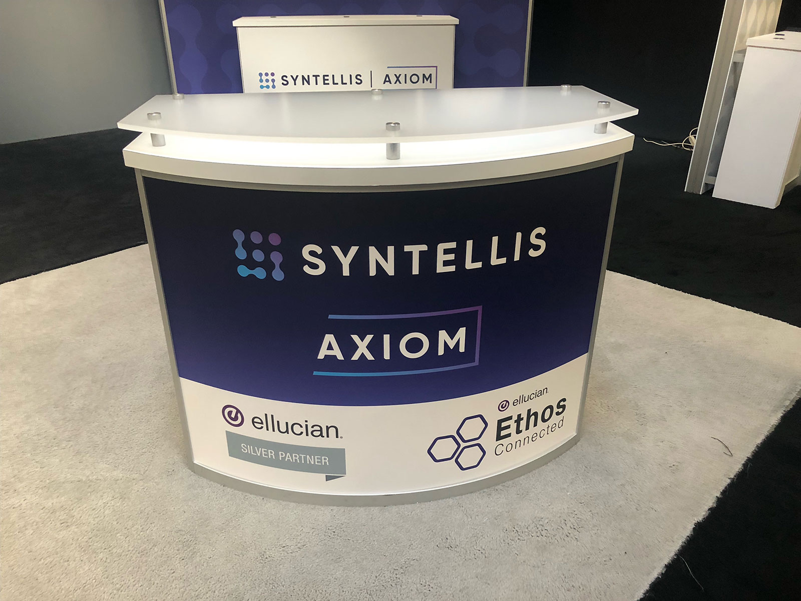 RENTAL: Modified RE-9119 Island Rental Design with 16' High Curved Gravitee System Tower, (2) Workstation Kiosks with RE-1227 Small Rectangular Counters, RE-1207 Counter with Curved Top, RE-1250 Reception Counter, RE-703 Charging Station Table, (2) 60" Monitors, (2) 32" Monitors, SEG Fabric Graphics, and Direct Print Sintra Graphics