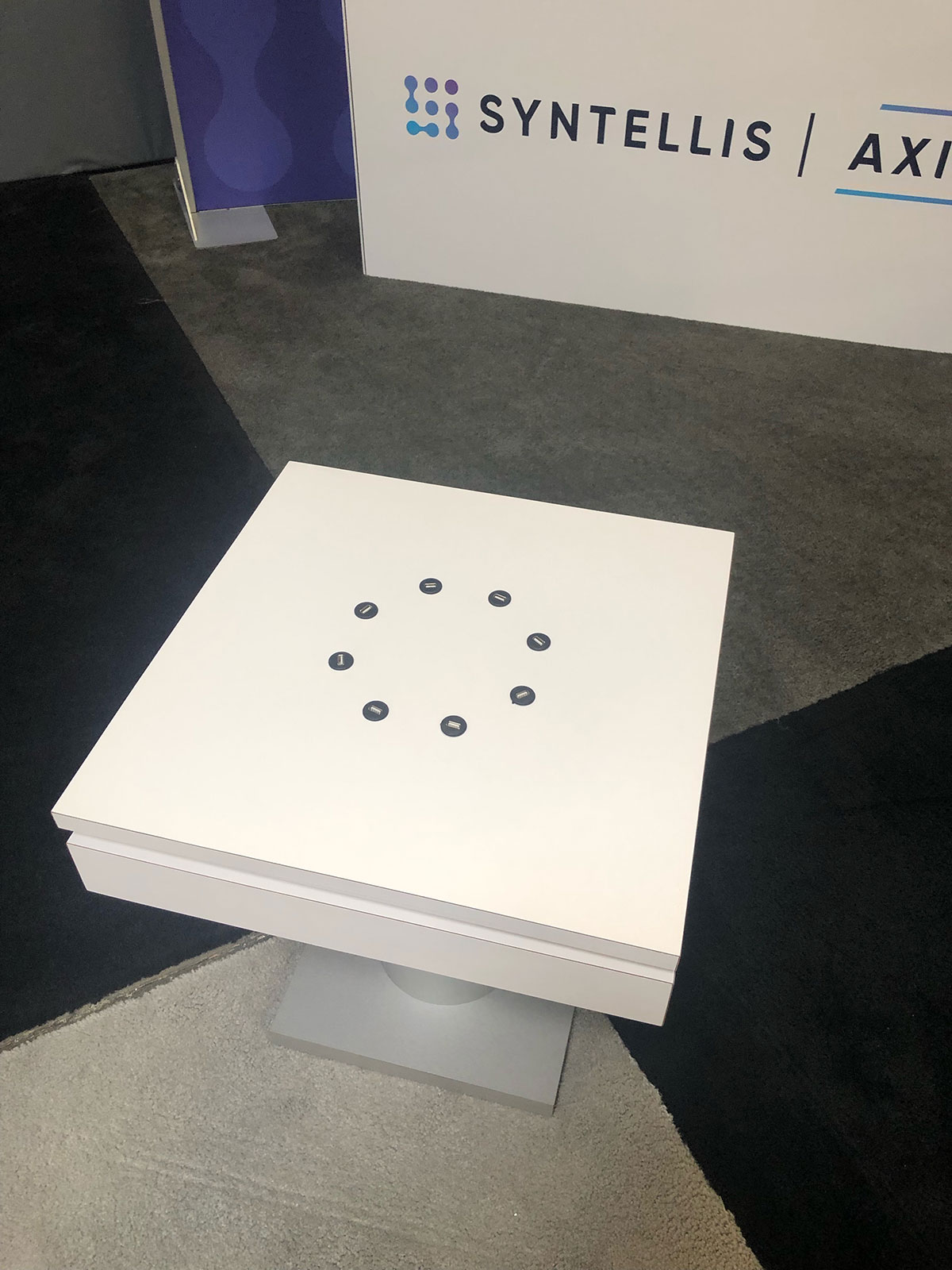 RENTAL: Modified RE-9119 Island Rental Design with 16' High Curved Gravitee System Tower, (2) Workstation Kiosks with RE-1227 Small Rectangular Counters, RE-1207 Counter with Curved Top, RE-1250 Reception Counter, RE-703 Charging Station Table, (2) 60" Mo Rental Workstations with RE-1227 Counters Rental RE-1207 Curved Counter Rental RE-1250 Counter Rental RE-703 Charging Table
