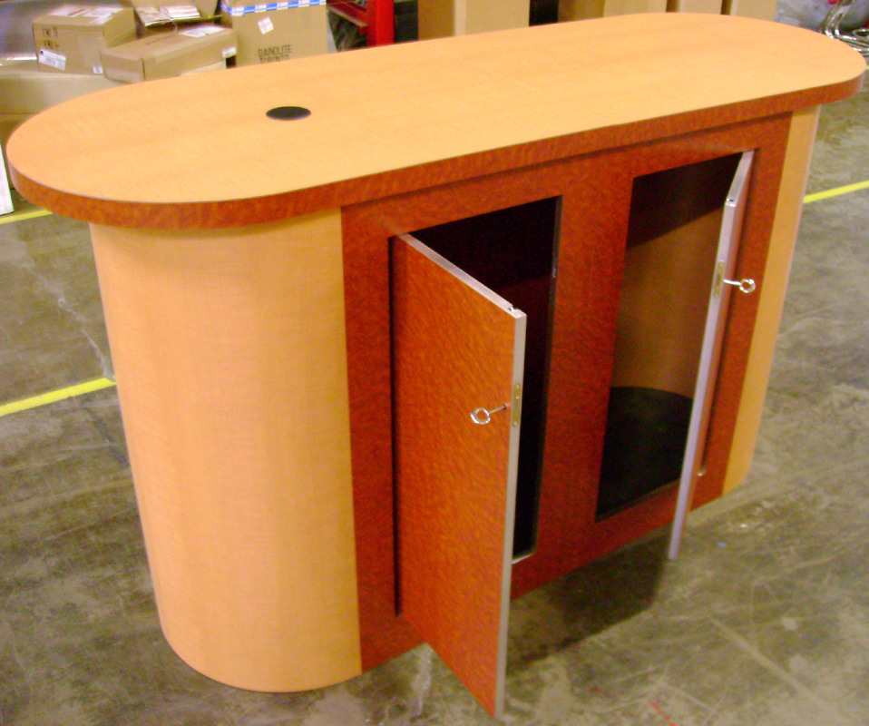 10' x 10' Euro LT Modular Laminate Display with Custom Stripe, and Euro LT Oval Counter Unit with Custom Graphics.