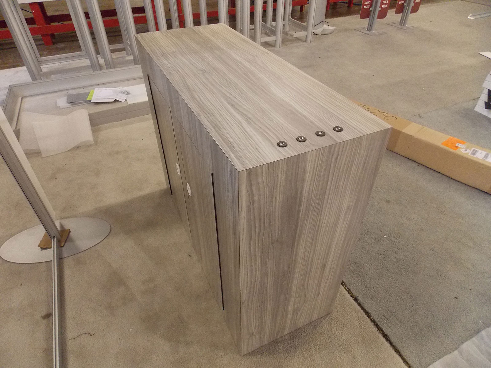 Custom Wood Counter with Locking Storage, Backlit Fabric Graphic, USB Charging Ports, and Pocket Counter Top Extension Custom Wood Counter with Locking Storage, Backlit Fabric Graphic, USB Charging Ports, and Pocket Counter Top Extension Custom Wood Counter with Locking Storage, Backlit Fabric Graphic, USB Charging Ports, and Pocket Counter Top Extension