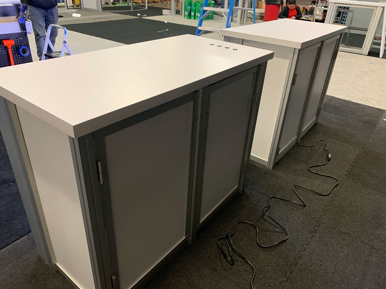 RENTAL: (2) RE-1567 Backlit Counters with White Laminated Tops, (One with USB Charging Ports), and SEG Backlit Fabric Graphics. RENTAL: (2) RE-1567 Backlit Counters