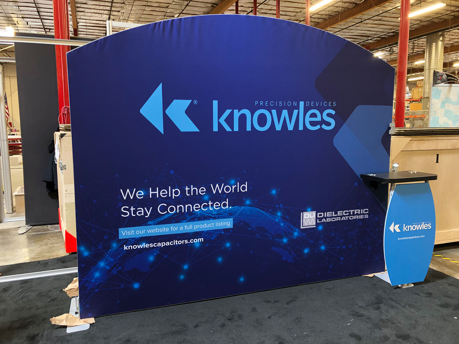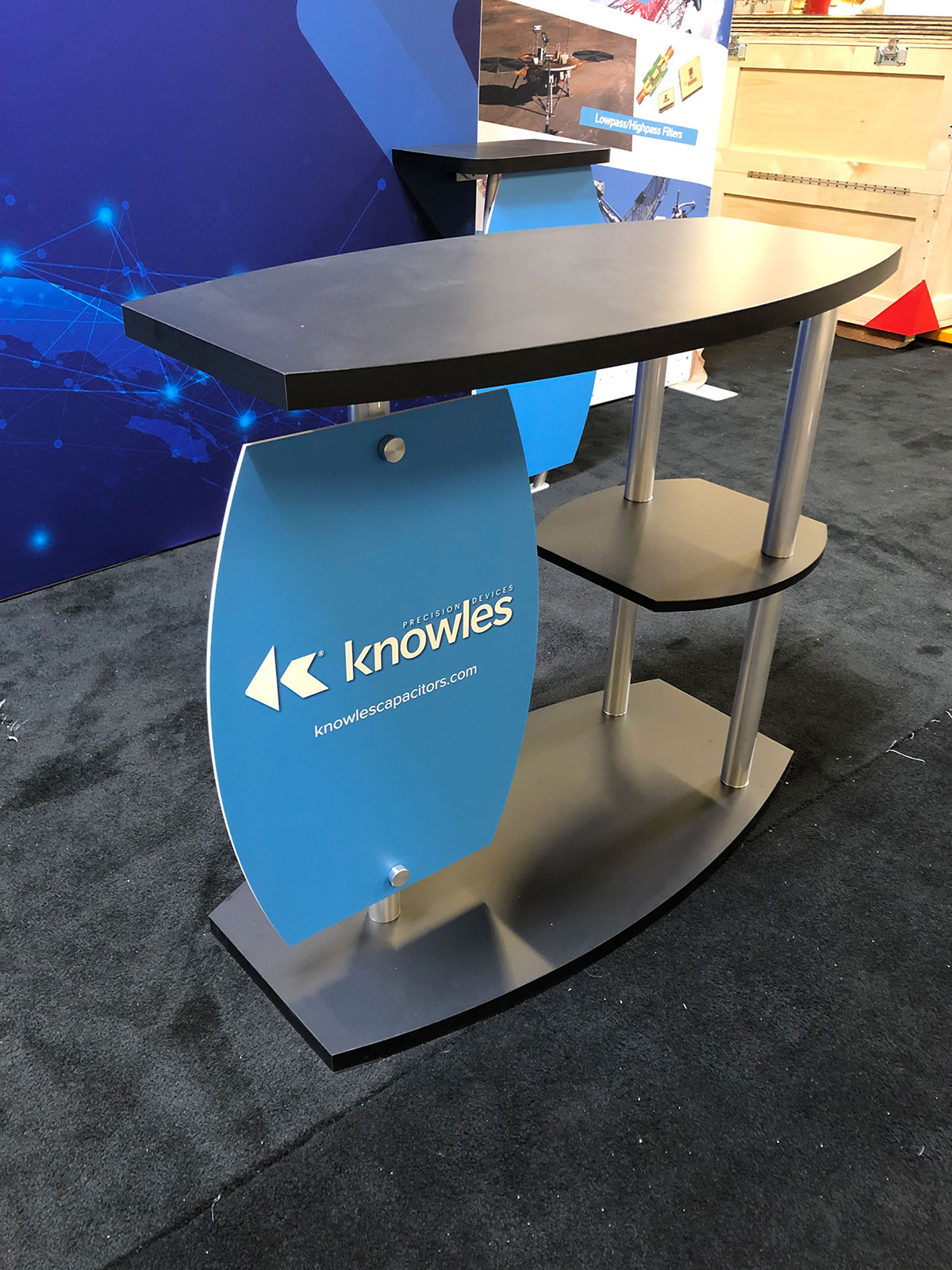 Modified SYK-2007 Symphony Portable Display with SEG Fabric and Direct Print Graphics, (2) Backwall Workstations, Monitor Mount, (1) SYM-403 Counter, Literature Trays, and Wireless Charging [58438]