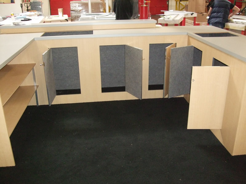 Custom Modular Laminate Counters with Locking Storage and Shelves for Island Exhibit -- Image 1 Custom Modular Laminate Counters with Locking Storage and Shelves for Island Exhibit -- Image 2