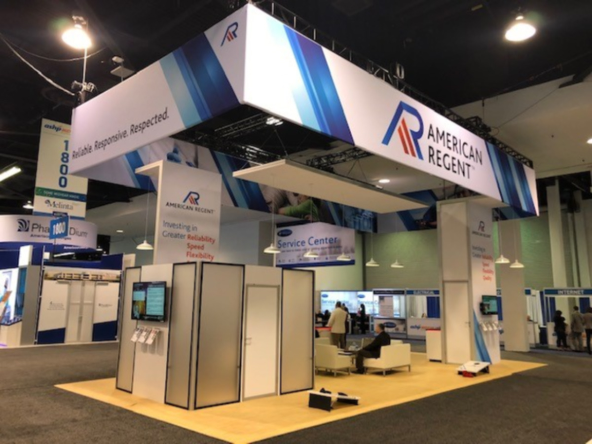 RENTAL: Custom Island Design with Conference Room, 16 ft. High Graphic Tower, 16 ft. High Storage Room Tower, Suspended Canopy Structure, Pendant Lights, Large Monitor Mounts, Custom Counters, (14) RE-170 Literature Shelves, Silicone Edge Fabric Graphics, and Sintra Graphics