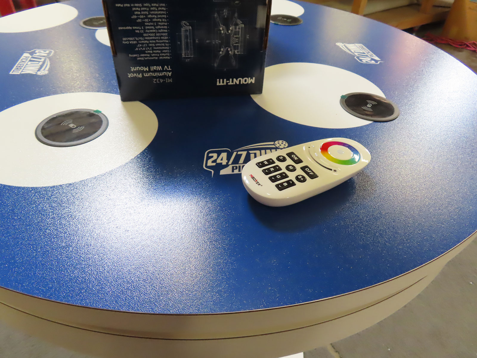 Modified MOD-1474 Workstation with (2) Monitor Mounts, (4) Wireless Charging Pads, and RGB  Programmable LED Perimeterr Lights Modified MOD-1474 Workstation with (2) Monitor Mounts, (4) Wireless Charging Pads, and RGB  Programmable LED Perimeterr Lights