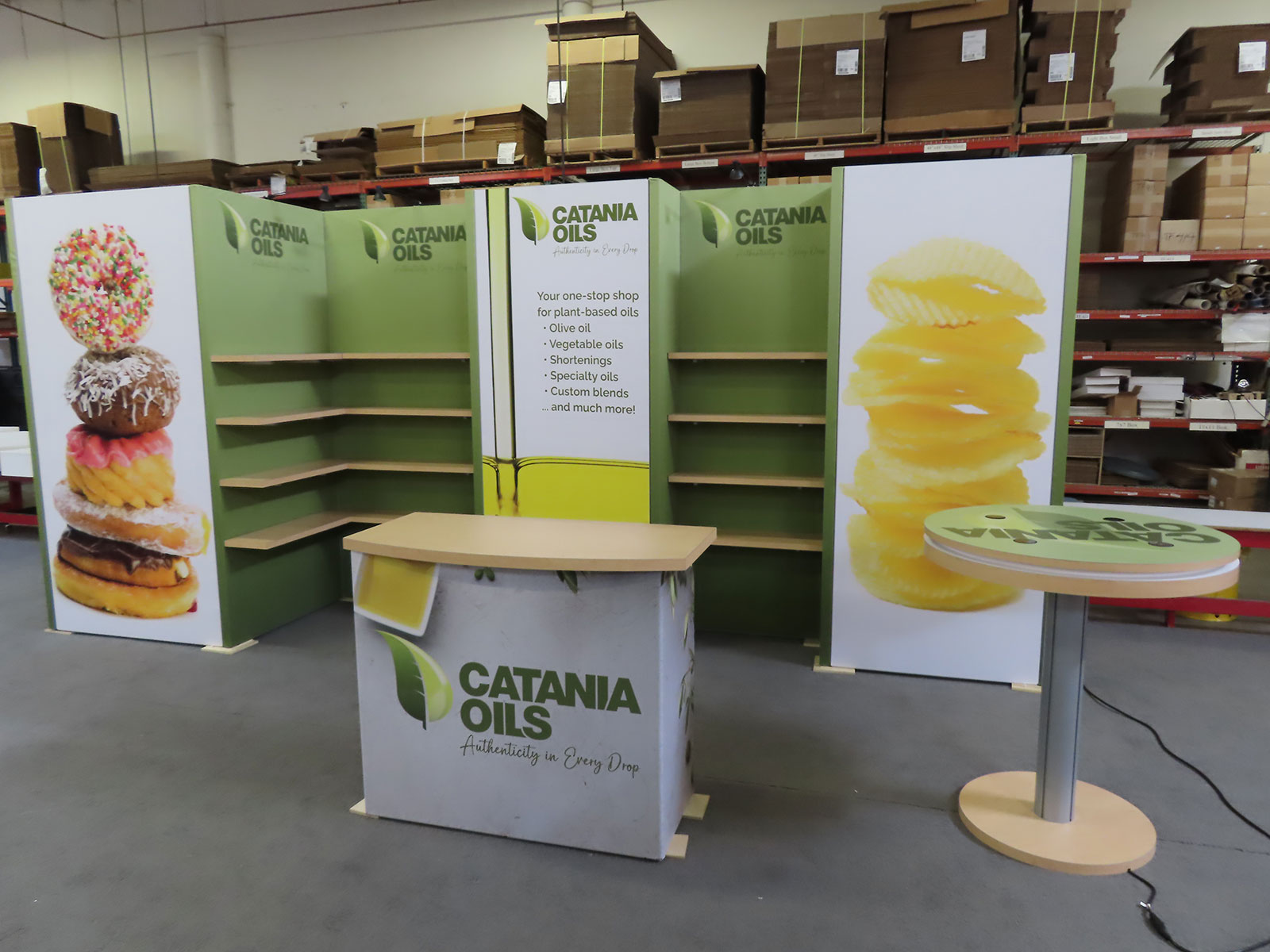 Modified GK-2023 (Reconfigures to GK-1015) Gravitee Modular Exhibit with Backlit Graphics, (12) Shelves with Accent Lighting, Closet Storage, SEG Fabric Graphics, and MOD-1453 Charging Table with Wireless Charging Pads and LED Perimeter Accent Lights [ORD-65481]