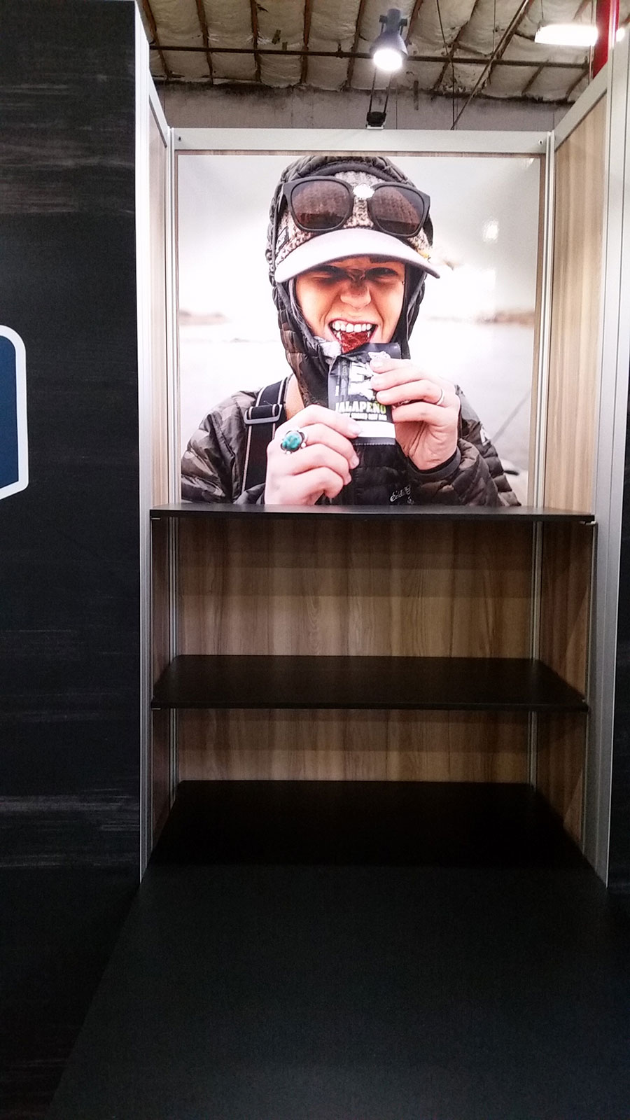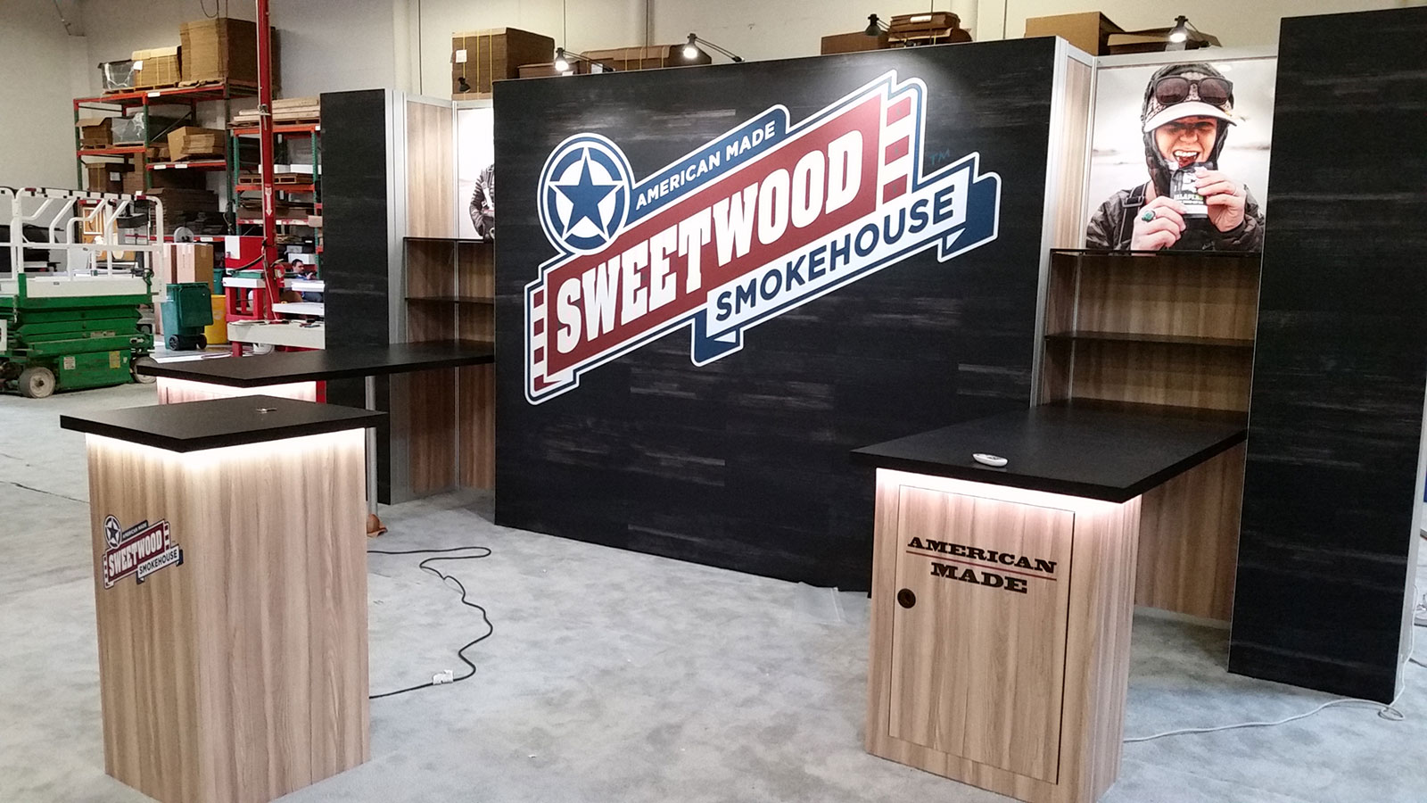 Custom Visionary Designs Exhibit with Large Format Fabric Graphics, (3) Pedestals with Locking Storage, and Shelves Custom Visionary Designs Exhibit with Large Format Fabric Graphics, (3) Pedestals with Locking Storage, and Shelves Shelves, Graphic, and 5 W Stem Light