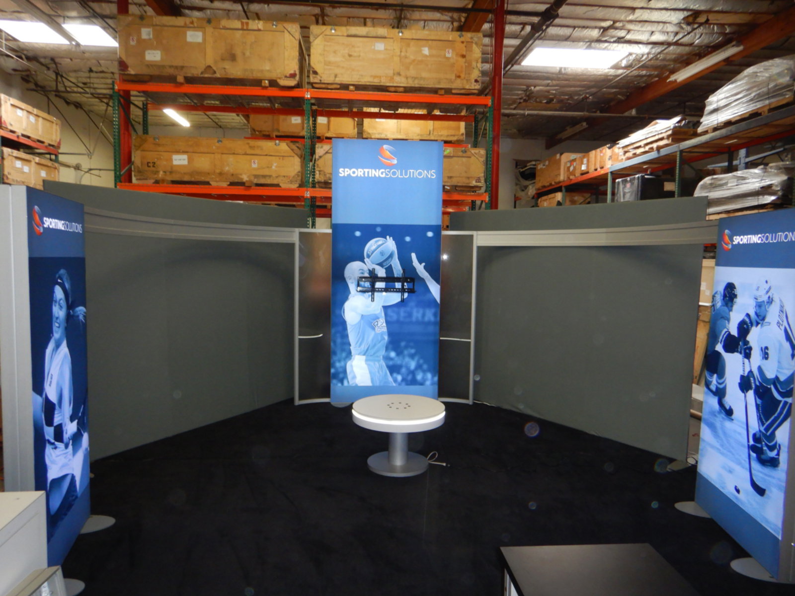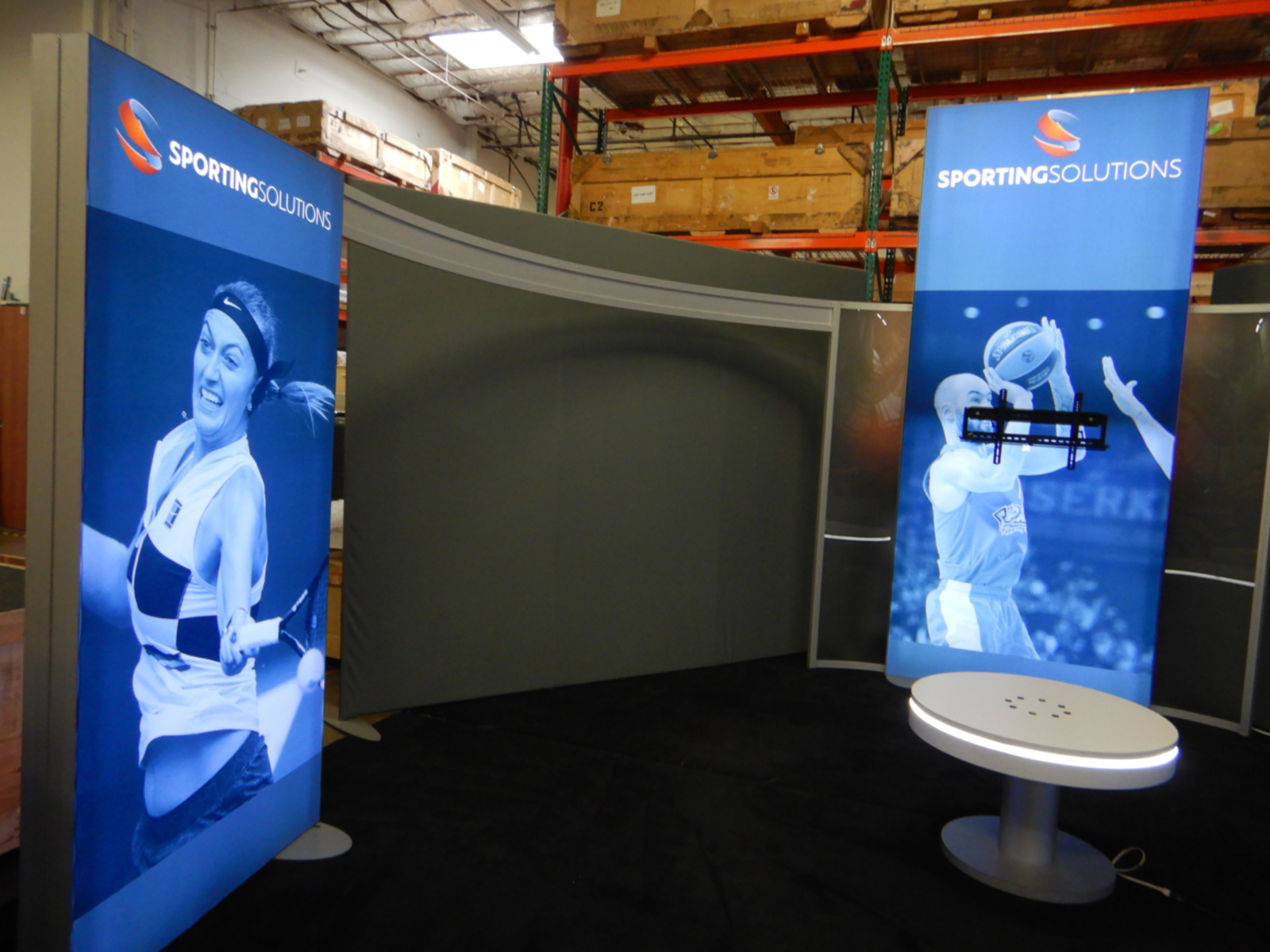 RENTAL: RE-9096 Island Design with (3) Double-Sided Lightboxes, Frosted Acrylic Accent Wing Panels, Medium Monitor Mount, RE-702 Charging Station Table, and SEG Backlit Fabric Graphics