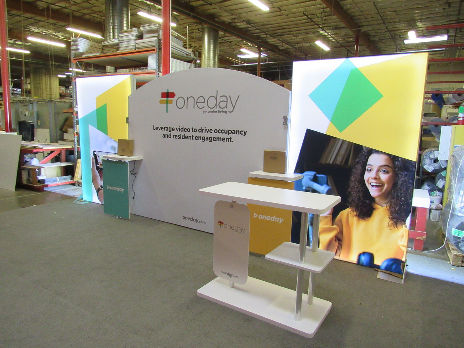 SYK-2029 Backlit Symphony Portable Display with (2) Backlit SuperNova Lightboxes, SEG Fabric Graphics, (2) Workstations with Graphics, Wireless Charging Pads, (2) Monitor Mounts, and an SYM-404 Counter with Shelf